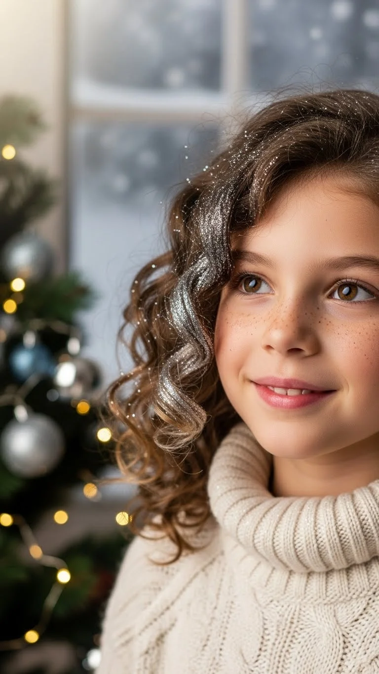 Frosted curl tips give curls a fun holiday sparkle. Dip your fingertips in lightweight kid-safe glitter gel and tap only the ends. Keep it subtle so cleanup stays easy. The shimmer looks lovely under bright lights. If your child’s hair is straight, you can curl just the ends with foam rollers. Glitter gel is inexpensive and washes out quickly. This style works well for festive evenings.