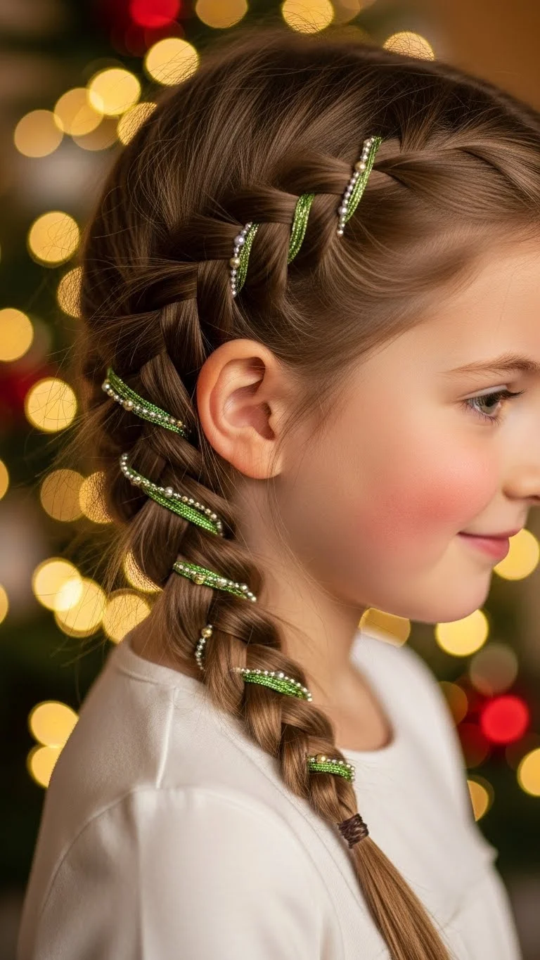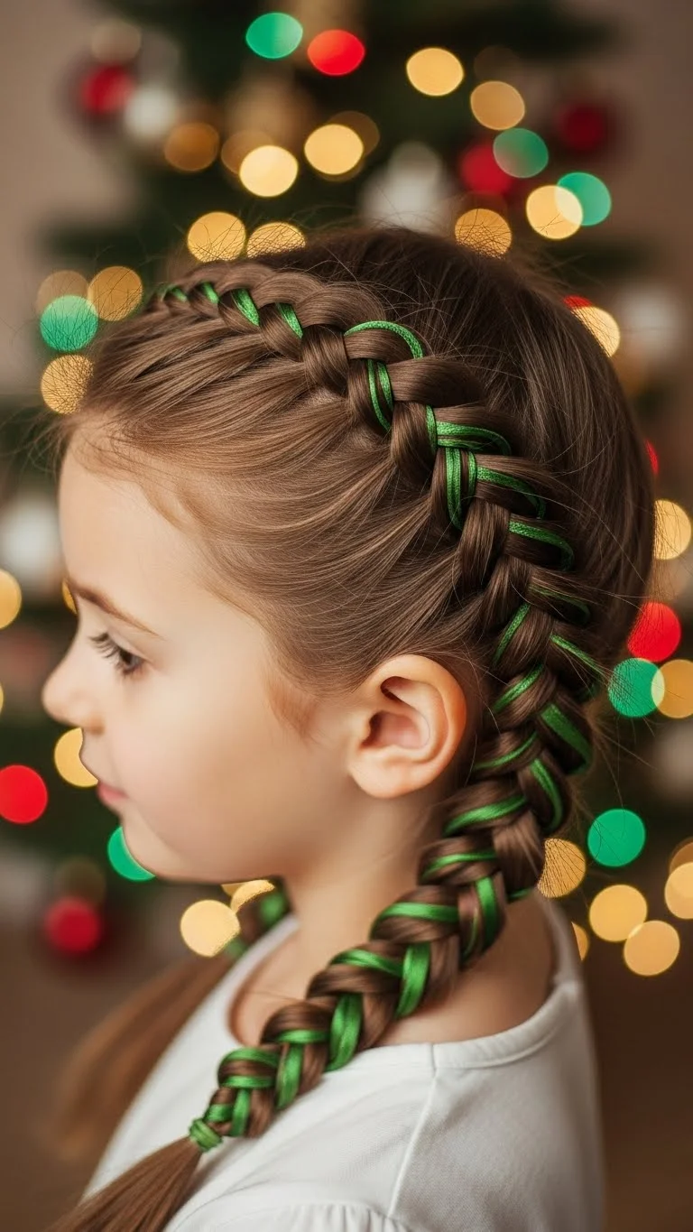 Holiday Dutch braids stay tidy all day. Make two inside-out braids and weave thin green ribbon along one side. Use safety loops at the ends so the ribbon doesn’t slip. If your child has short hair, braid only the top half. Dutch braids keep hair away from the face, making them great for active days. This style looks detailed but doesn’t require fancy tools.
