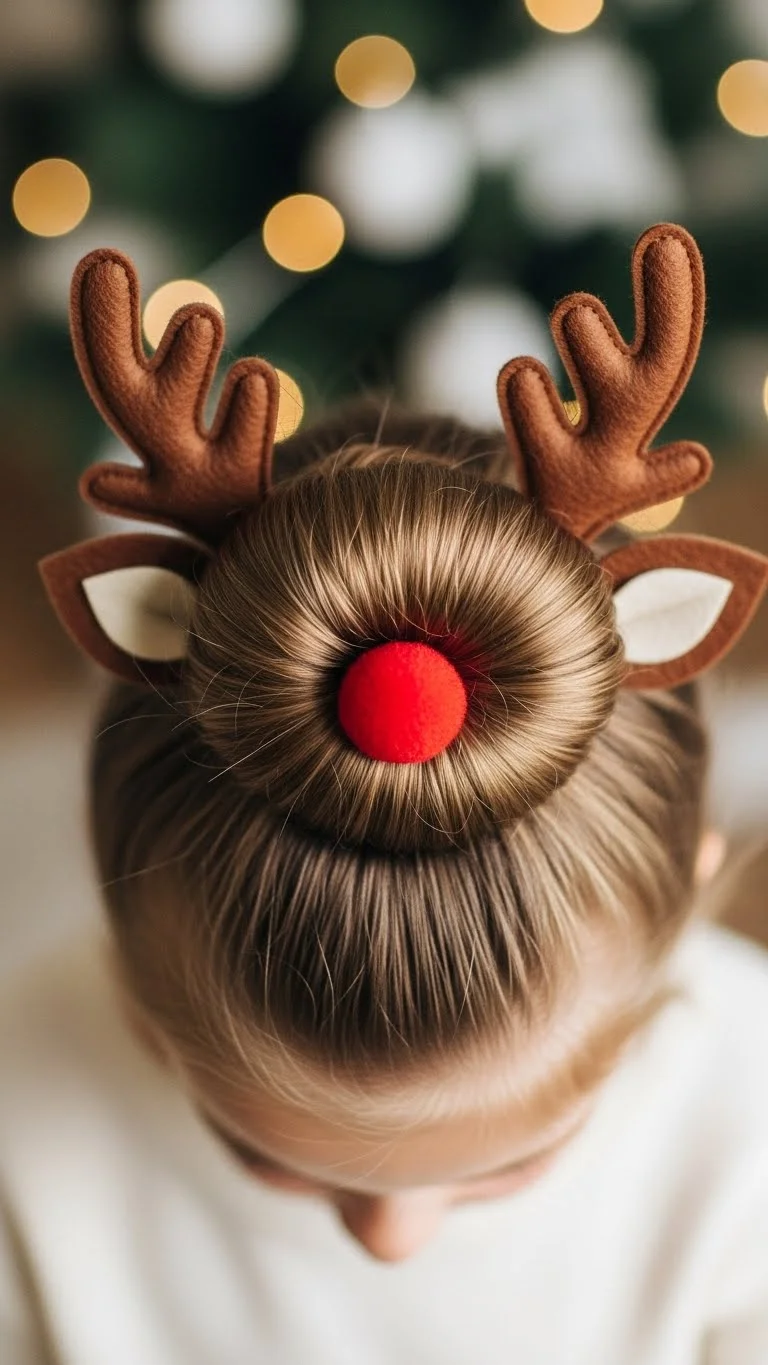 A reindeer bun is playful and simple. Form a medium bun and attach felt antlers using small clips. Add a red pom-pom at the front to mimic a bright nose. Felt is affordable and comfortable. You can cut antlers yourself in minutes. This hairstyle suits school events and photo sessions. Keep the bun loose so it doesn’t tug when kids move.