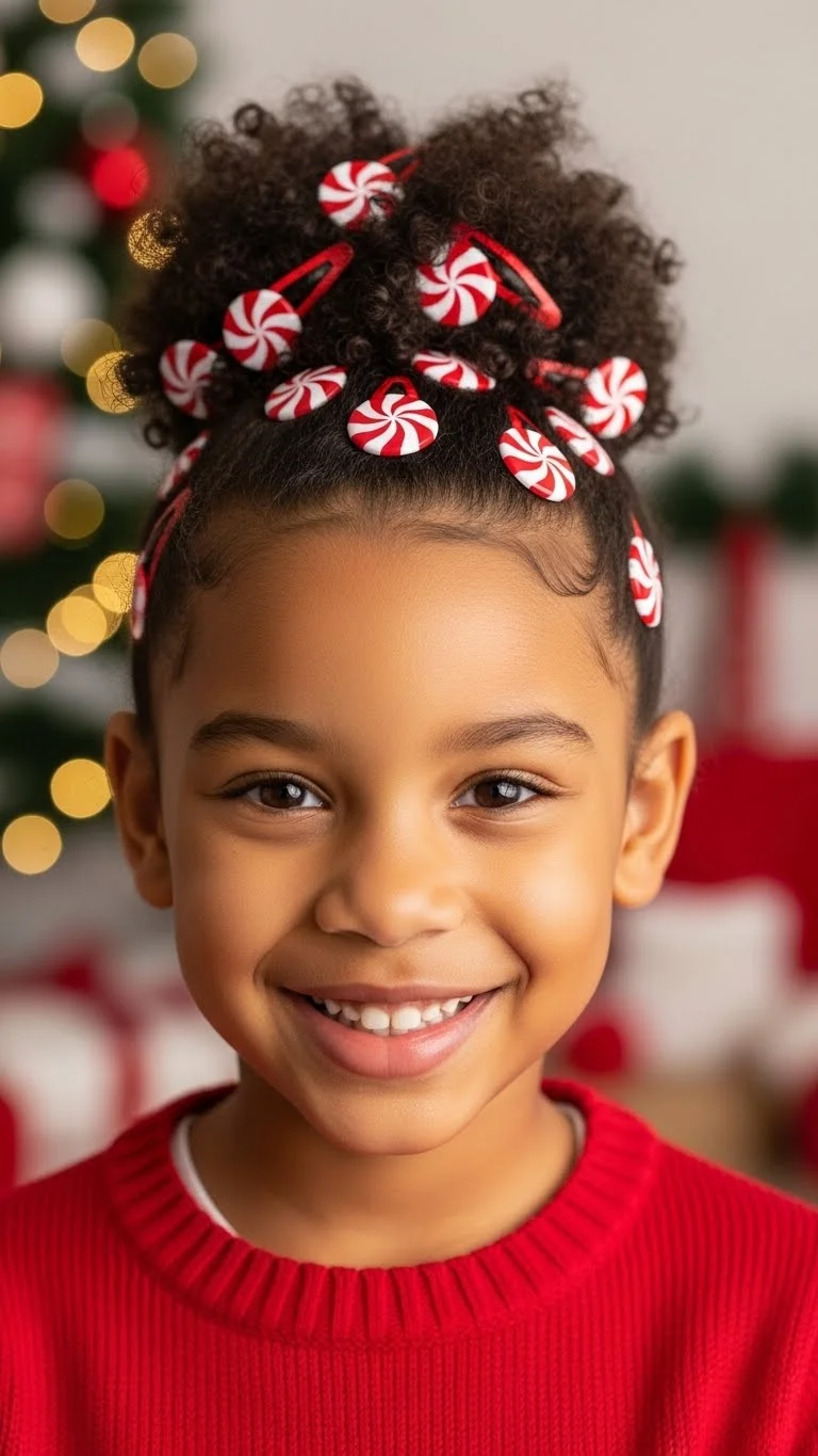 A peppermint puff pony suits curly and coily hair. Gather a high puff and add red-and-white swirl clips around the base. If hair is short, try a mid-level puff instead. These clips are cheap and easy to find. This look stays secure through play because the puff keeps its shape naturally. It’s bright, simple, and perfect for busy mornings.