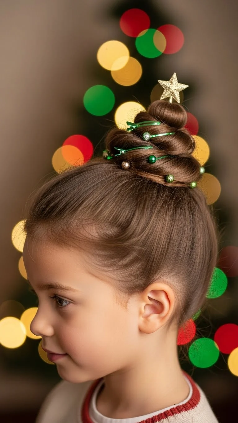 A mini Christmas tree bun makes any outfit feel festive. Form a high bun using a soft elastic. Then pull small strands outward to create a gentle cone shape. Add tiny green clips or beads to mimic ornaments. A gold star clip at the top completes the look. If your child has thin hair, wrap a mesh bun maker inside to add height. You can also use short pieces of green pipe cleaner bent around the bun for extra detail. They’re inexpensive and lightweight. Keep the bun loose so kids stay comfortable. For a smoother finish, glide a bit of water on flyaways rather than heavy products. This fun look lasts through school plays, photos, or long family outings.