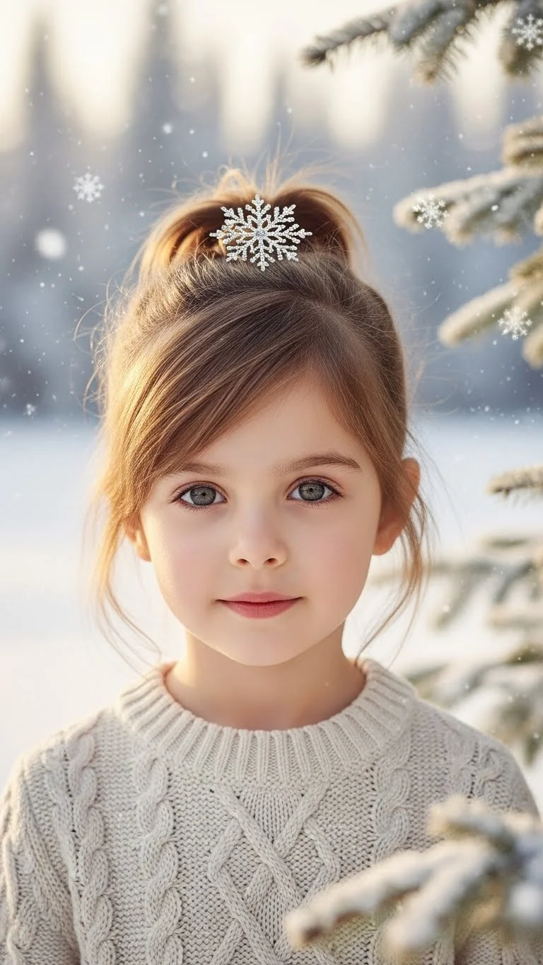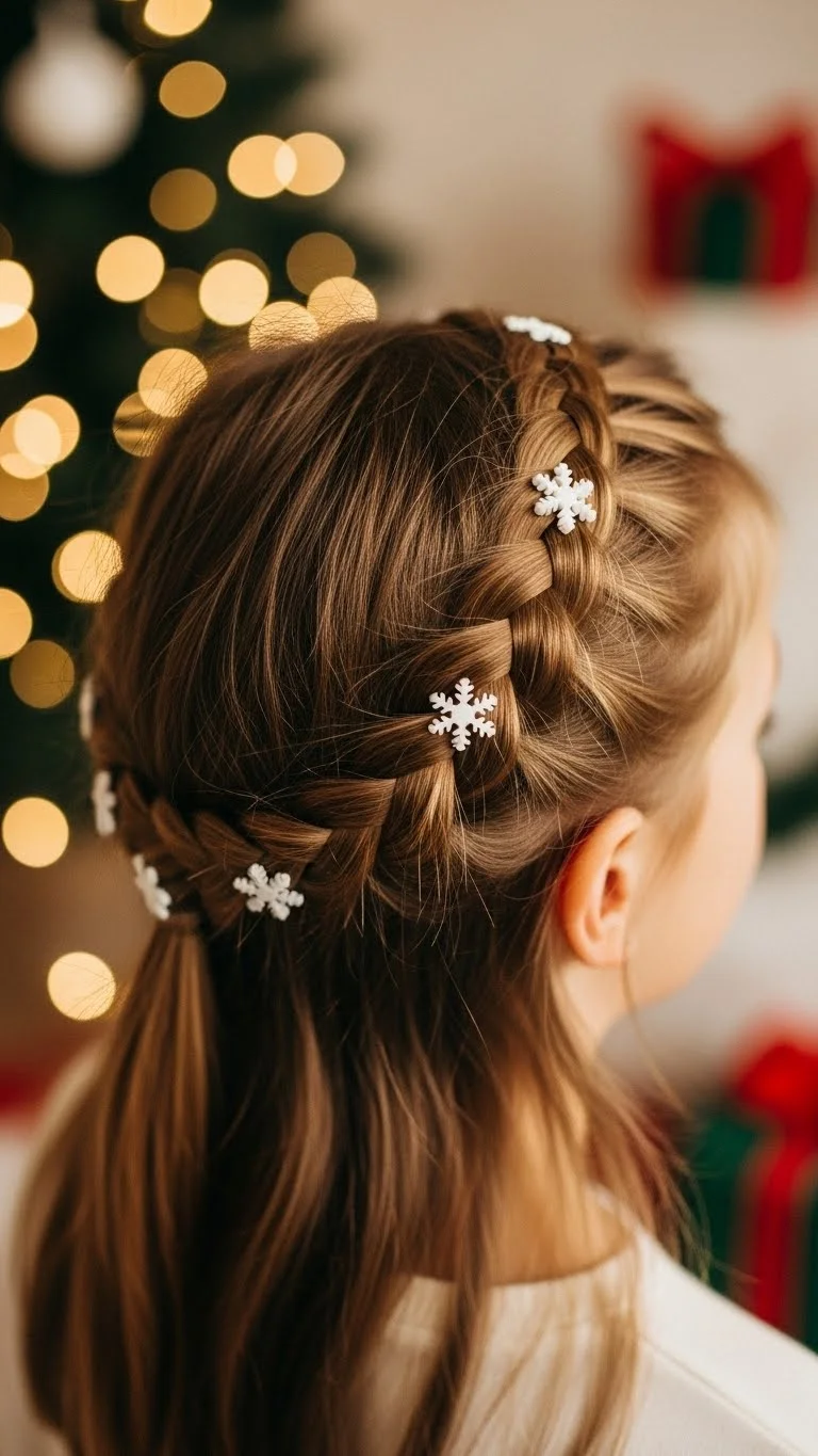 A snowflake half-up style fits any occasion. Section the top half of the hair and secure with a soft elastic. Add a snowflake clip on top for winter charm. If the hair is wavy, leave it natural for a relaxed look. Straight hair works too. You can braid the half-up portion if you want more detail. Plastic snowflake clips are affordable and light. This style is simple enough for school mornings yet cute for holiday pictures.