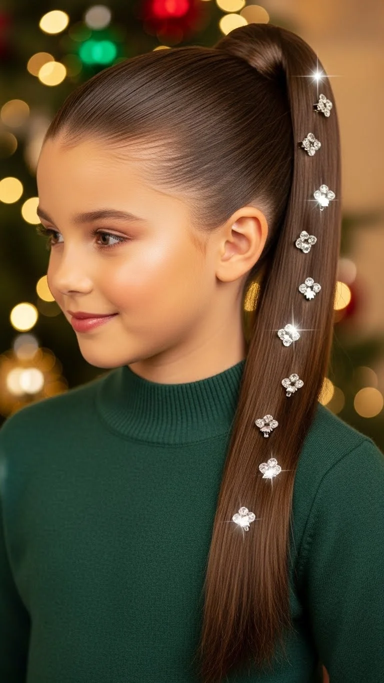 A winter sparkle pony shines under lights. Make a simple ponytail and place small crystal-style clips along the tail. Use lightweight ones so they don’t pull. This works with straight or wavy hair. You can also wrap a strand around the elastic for a cleaner finish. Budget-friendly clips from craft stores do the job well.