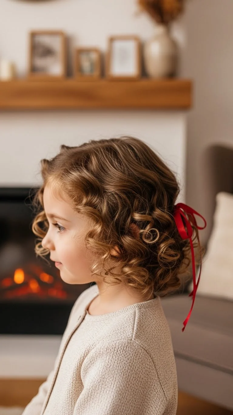Holiday spiral curls look sweet and bouncy. Use foam rollers overnight or twist hair while damp. Tie a thin ribbon at the back to finish. This style works on most hair types. If curls fall quickly, refresh with water instead of heavy product. Ribbons cost little and add color right away. Kids enjoy the soft bounce during parties.