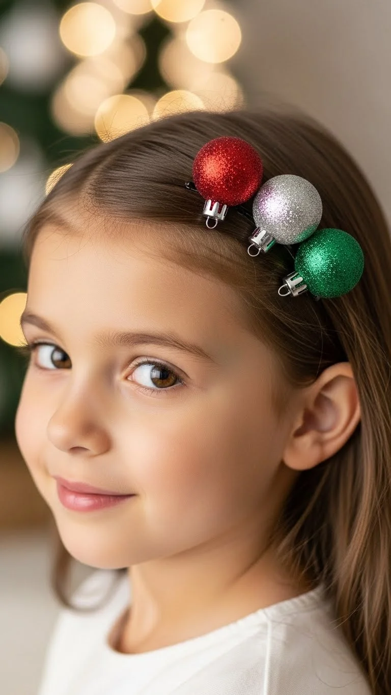 Three ornament clips in a row create a cute side accent. Place them along one part line or above the ear. They come in many colors at low prices. This style works on loose hair, curls, or ponytails. Kids love matching them to outfits. It takes seconds to do and adds instant holiday charm.