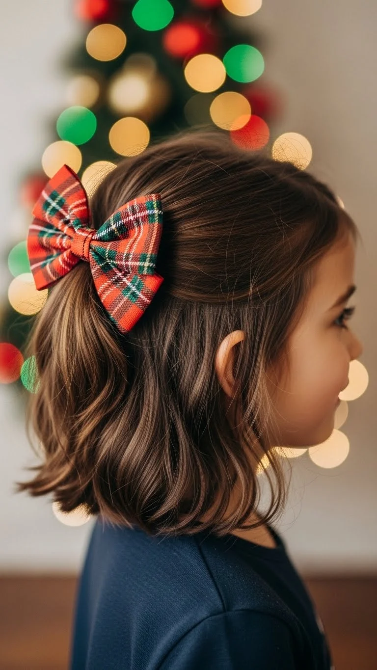 A bow bun looks fancy but uses simple steps. Pull the hair into a high ponytail. Loop the hair into two rounded sections, leaving a small strand out. Wrap that strand around the center to form the bow shape. Adjust the loops gently. If hair is shorter, use a faux bow clip instead. Add a red or green ribbon under the bun for color. This style works well for parties and photos. You don’t need gel or sprays—just a few elastics and bobby pins.
