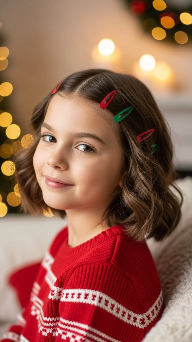 Soft waves with scattered clips give a relaxed holiday vibe. Add waves using braids left overnight or foam rollers. Place several red and green clips around the head. Keep them small so the look stays light. This style takes little effort and works for both short and long hair. Kids like the simple sparkle and the natural movement.