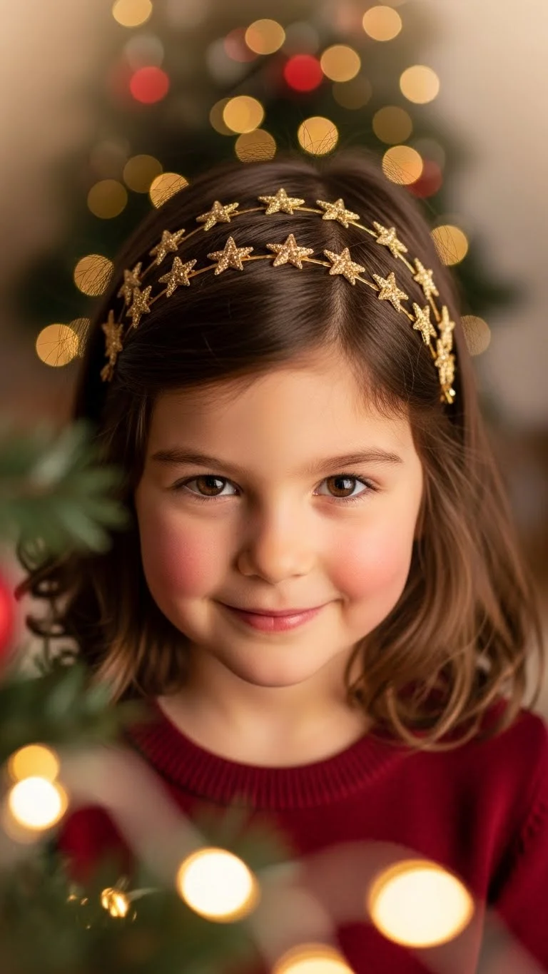 A star clip crown turns any hairstyle into a holiday moment. Place the clips in a gentle arc from temple to temple. Use clips of different sizes for a layered look. If your child has thick hair, slide a thin comb under each clip to help it hold. For fine hair, spray a bit of water first to create texture. Gold clips shine under indoor lights, while silver fits cooler outfits. This style pairs with loose curls, straight hair, or even a simple bun. It’s low effort and budget-friendly.