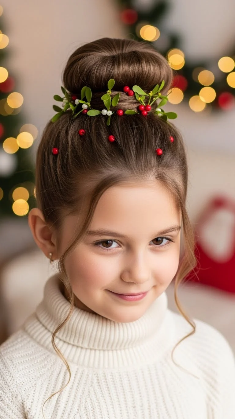 The mistletoe top knot brings soft holiday charm. Create a tall top knot and secure it lightly. Add small green leaves made from felt or leftover craft materials. Slip in a few red beads or tiny clips to form the berry look. This style stays comfortable for hours. Felt is cheap and safe for kids because it’s soft. You can glue the leaves to a clip to make the process faster on busy mornings.