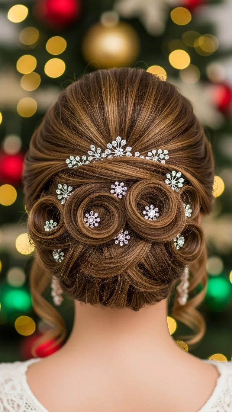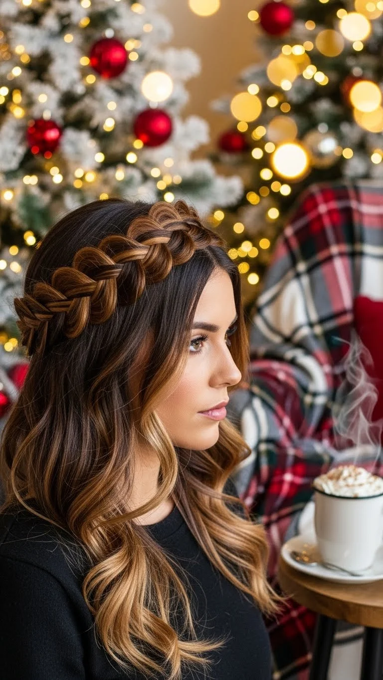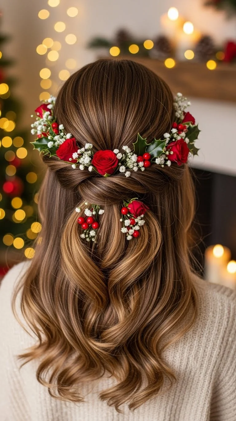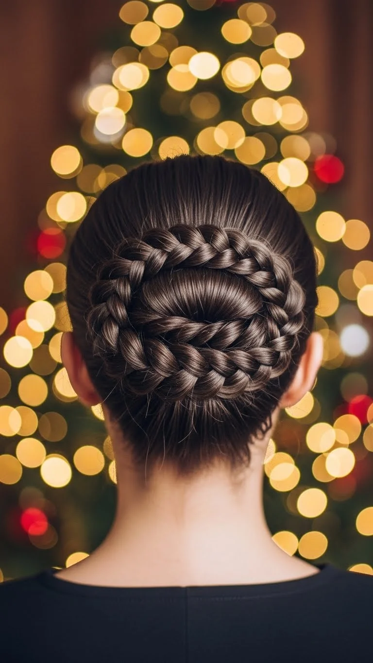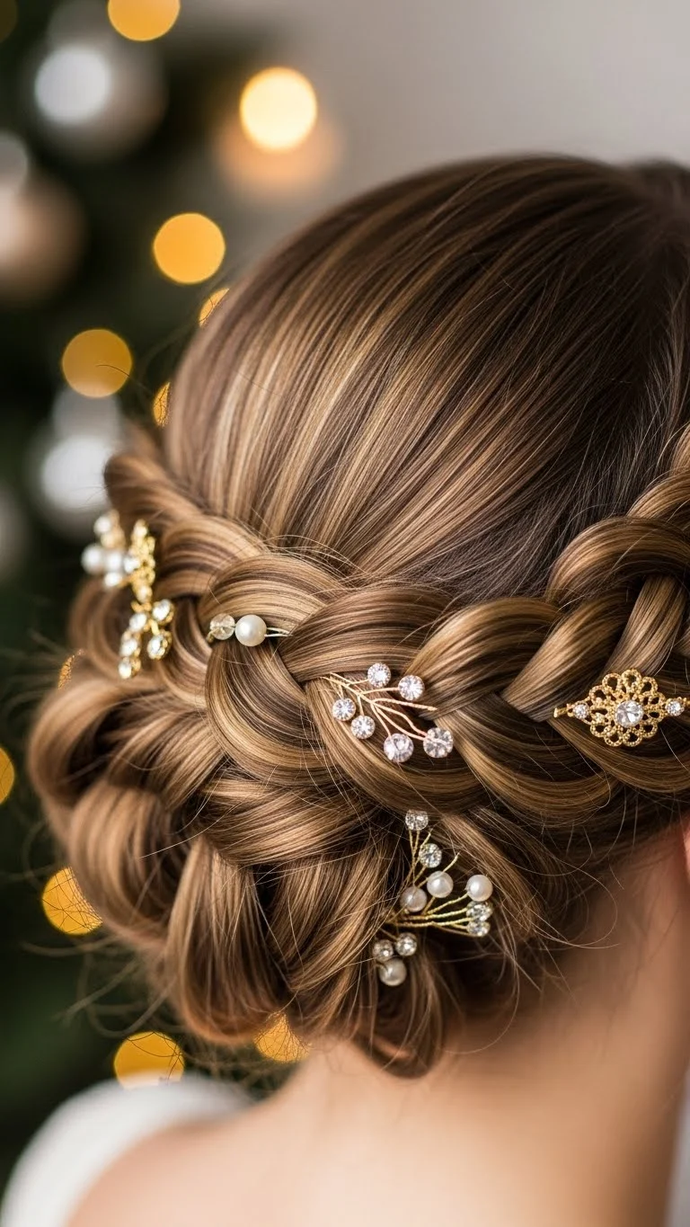 A braided halo is both pretty and festive. Braid sections of hair from each side and wrap them around your head, securing with pins. Add floral accents or holiday-themed hairpieces for a delightful finish. This updo is perfect for formal events and adds a touch of charm to your Christmas celebrations.