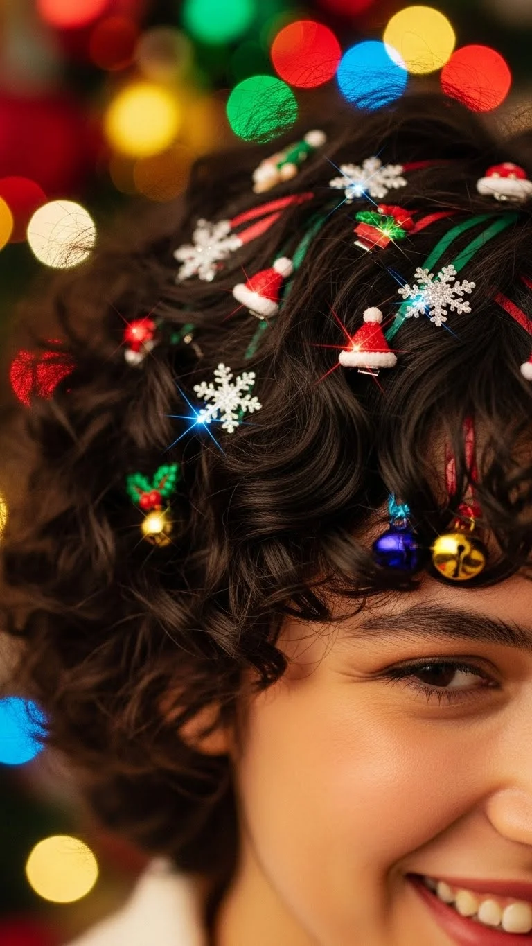 Short, sassy curls add a fun element to your Holiday look. Use a small curling iron to create defined curls and fluff them out for a voluminous effect. For a festive touch, add sparkly hair clips or ornaments tucked into your curls. Perfect for any gathering, this hairstyle radiates cheer and charm!