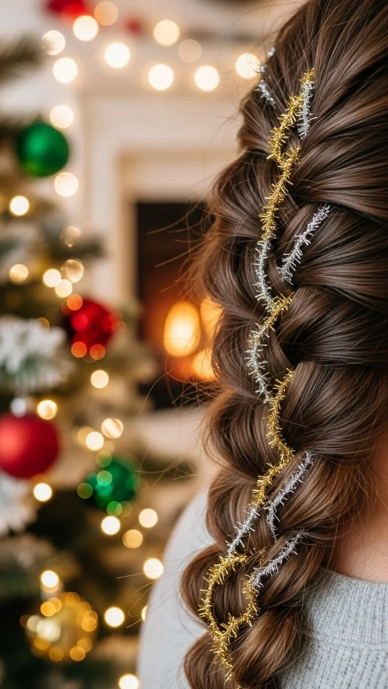 A half-up braid with tinsel adds a fun twist. Braid the top section of your hair, intertwining some tinsel for sparkle. Secure with an elastic and let the rest flow free. This playful style works well for casual gatherings and embraces the festive spirit beautifully.