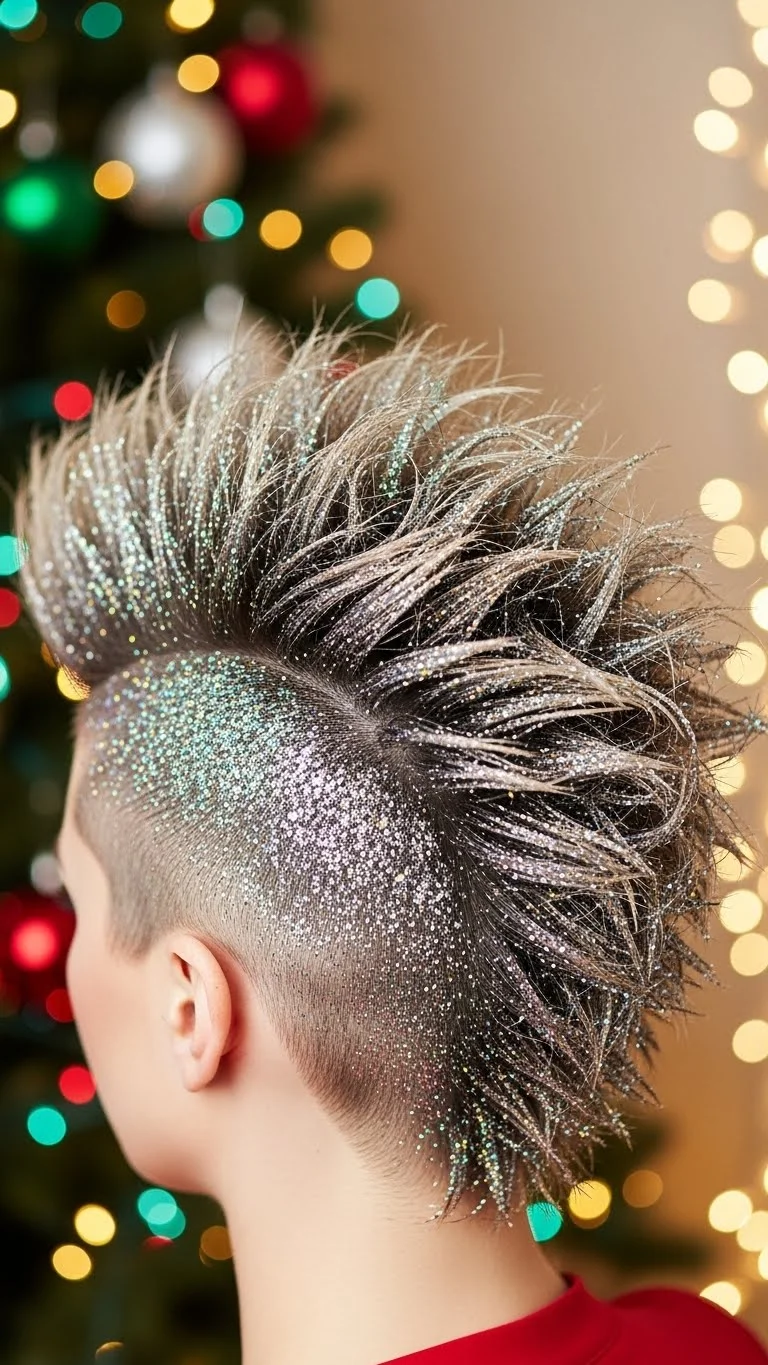 Embrace an edgy look with a faux hawk adorned with glitter. Style your hair upwards in sections, using gel for hold. Sprinkle some glitter on the sides for added sparkle. This daring choice is perfect for holiday parties where you want to stand out and express your personality!