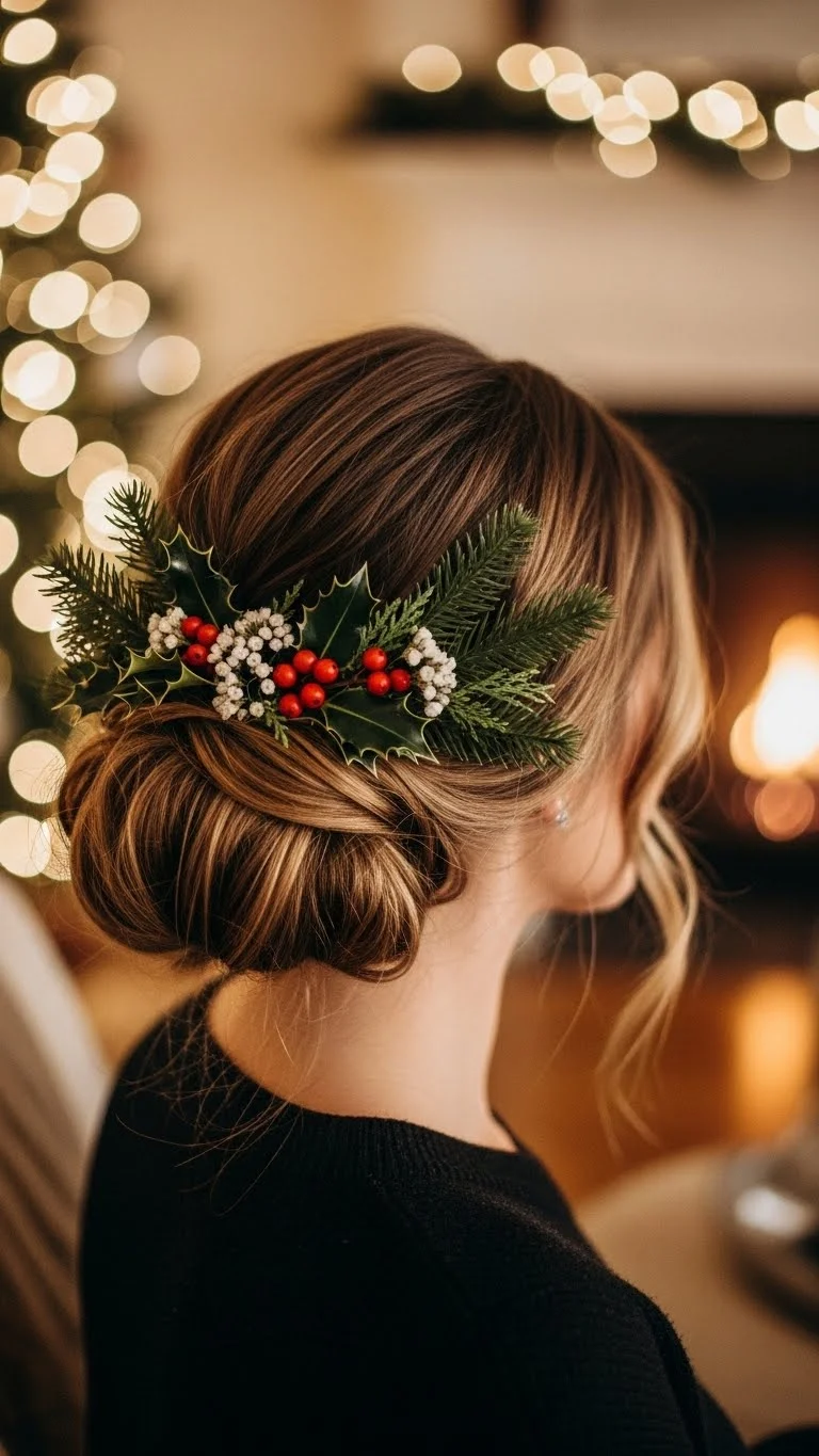 For a natural look, try a low messy bun garnished with greenery. Pull your hair into a loose bun and tuck in small sprigs of pine or holly. This whimsical style brings warmth and joy to your holiday appearance, making it a fantastic choice for family gatherings.