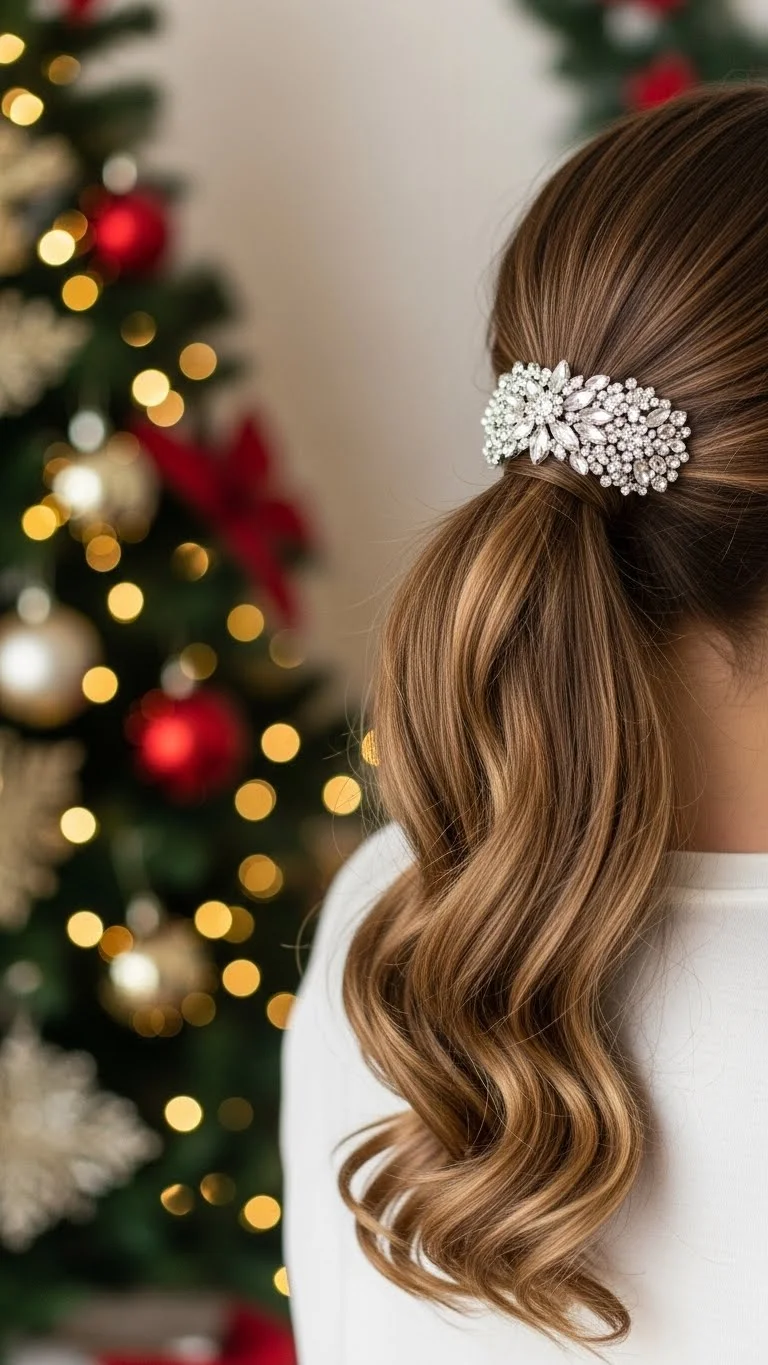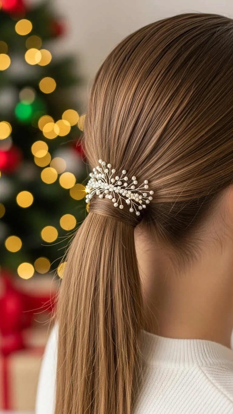 A sleek low ponytail offers a polished style with minimal effort. Straighten your hair and gather it at the nape of your neck, securing with an elastic. For a holiday twist, wrap a strand of hair around the base to hide the elastic. This look is perfect for formal parties and keeps you looking chic throughout the night. Plus, it’s quick to achieve!