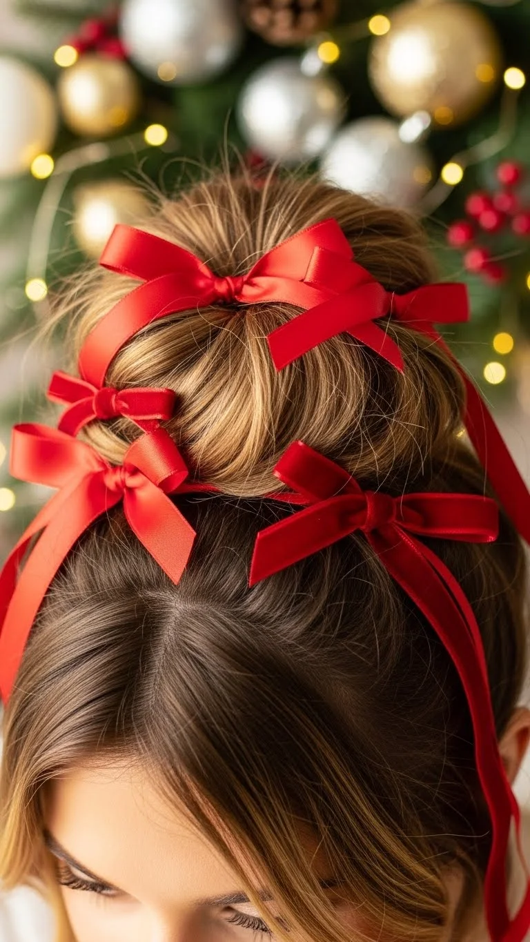 A messy bun is a reliable go-to for a casual holiday gathering. Gather your hair into a high ponytail and twist it into a bun, leaving some strands loose. Secure with hair ties. To increase the festive vibe, tie a red ribbon around the bun. This look is simple and versatile, making it an excellent choice for Christmas parties or cozy family nights.