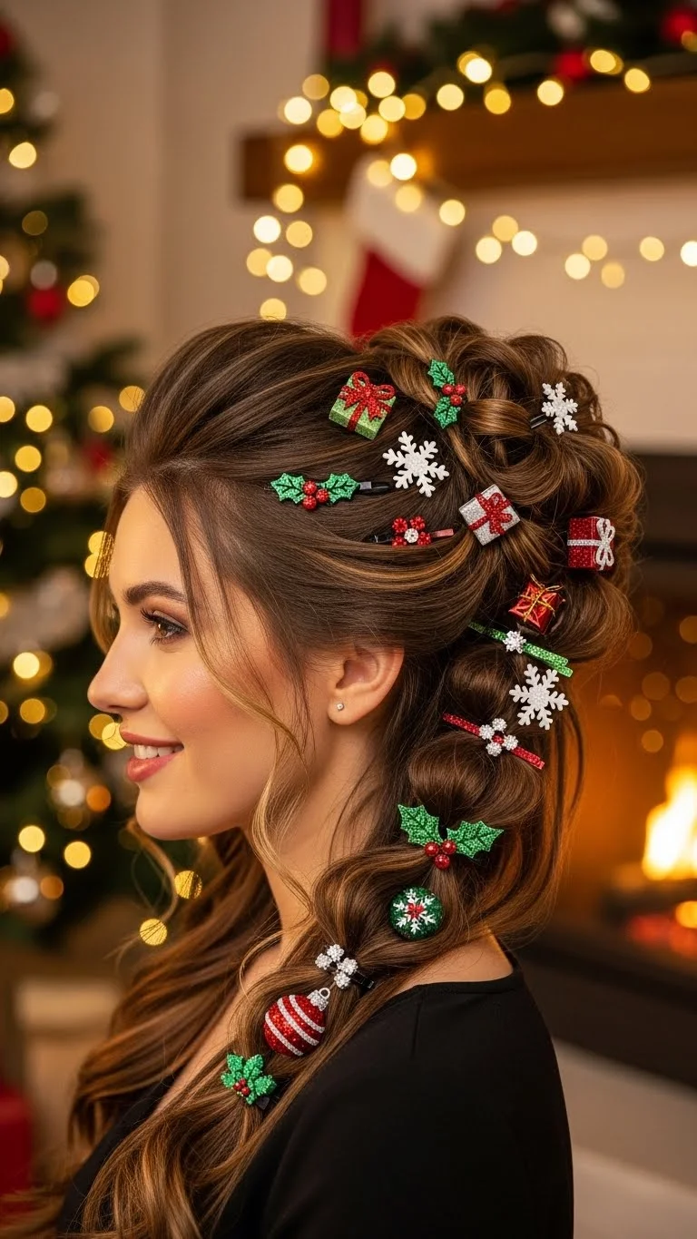 Create enchanted twists for an enchanting look. Part your hair and create two twisted sections on either side. Pin them back for a whimsical effect. Use colorful festive clips to secure the twists and add seasonal flair. This hairstyle is fun and perfect for any holiday event, making it easy to dress up or keep casual.