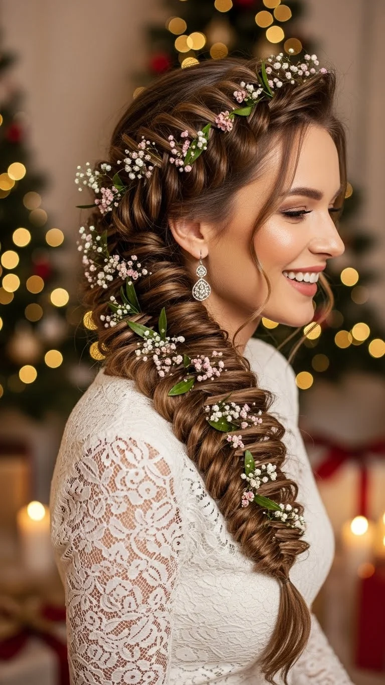 A romantic side braid adds softness to your holiday look. Gather your hair to one side and loosely braid it. Secure with an elastic and pull gently on the braid for volume. Adding small flowers or sparkles makes it festive. This hairstyle suits both casual and formal events, making it a versatile choice!