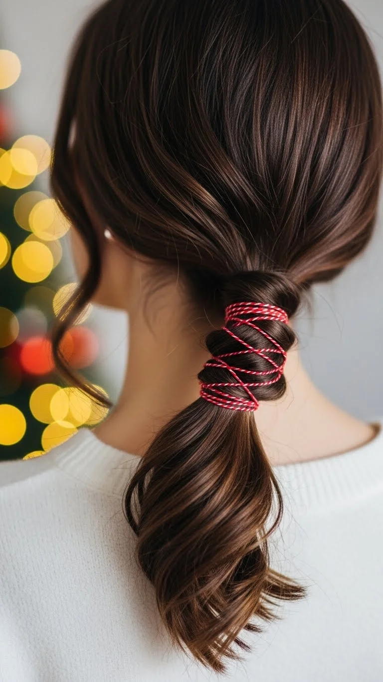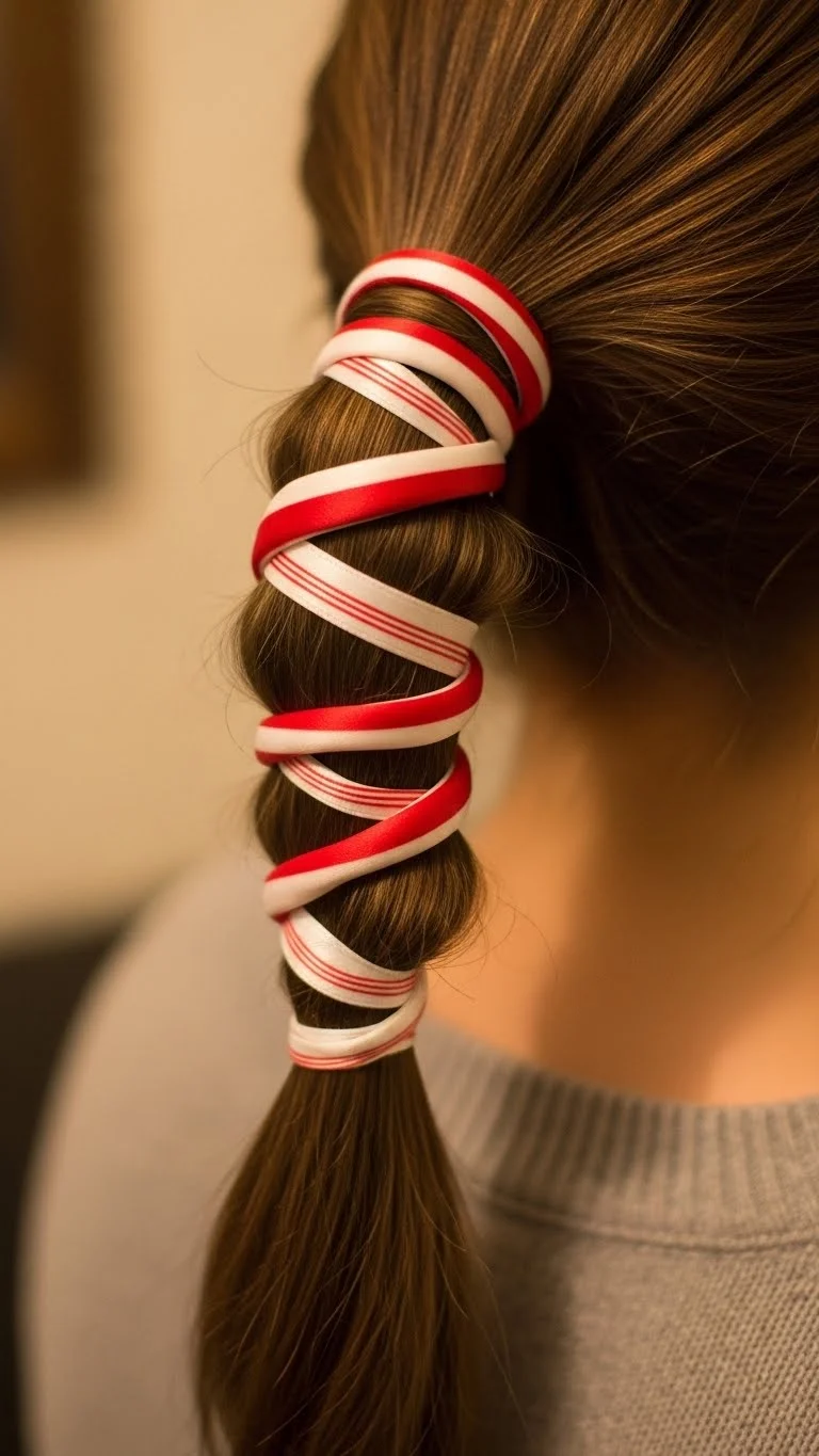 Start with a basic ponytail at the nape. Twist two ribbons—one red, one white—together and wrap around the ponytail base. Secure underneath with a bobby pin. Loose waves or straight hair both work. You can buy craft ribbon cheaply or repurpose gift ribbon. Light hairspray keeps the ribbon in place without stiffening hair. This playful style works for school events, casual parties, or family photos.