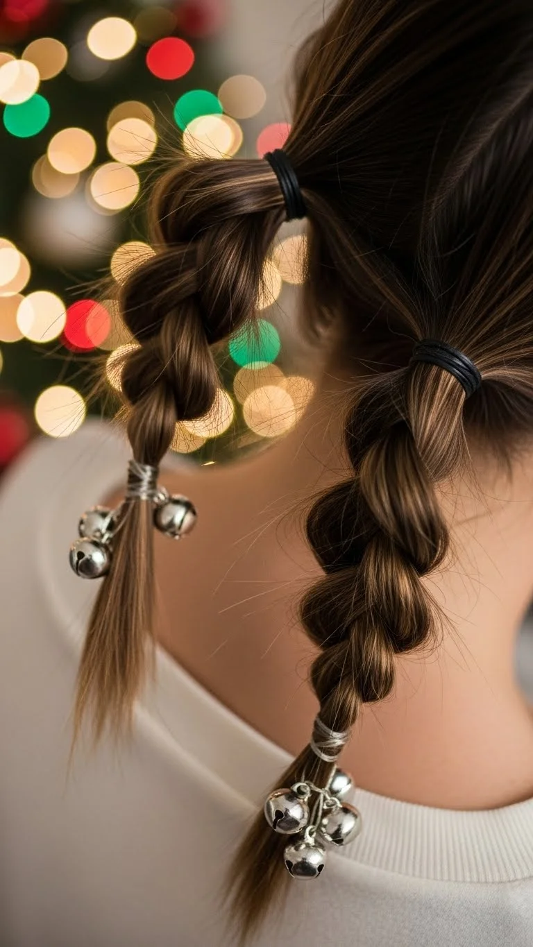 Divide hair into two sections. Twist each section and secure with elastics. Attach small jingle bells with thread or jump rings. Keep them light for comfort. Great for casual holiday fun or school events. Remove bells afterward for everyday wear. Clear elastics provide a neat finish.