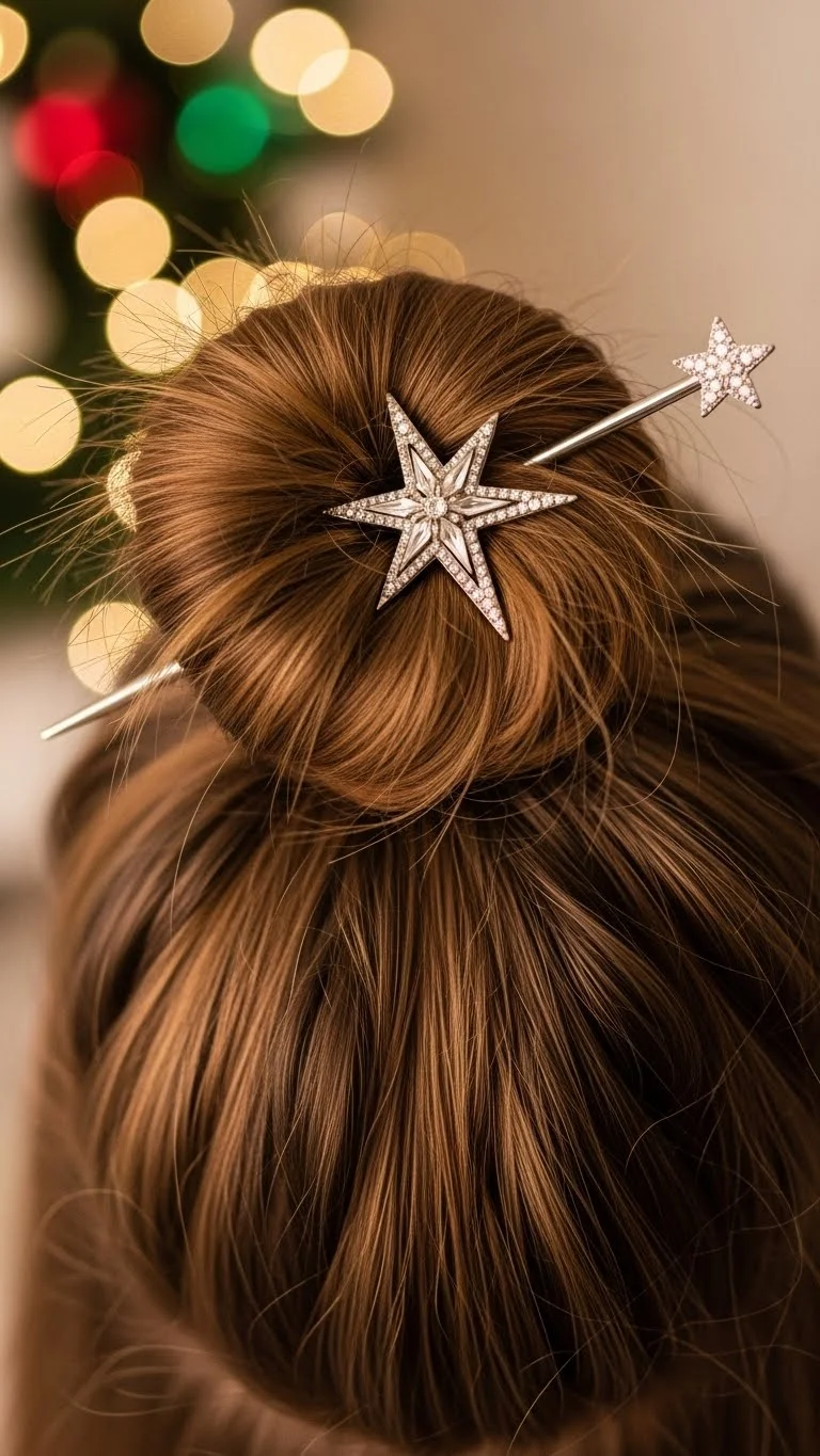 Twist hair into a loose top bun. Slide a star-shaped hair stick through the bun for a festive accent. Wooden or lightweight sticks are inexpensive and hold well. Works best for medium to thick hair. Remove easily after events, leaving a simple bun behind.