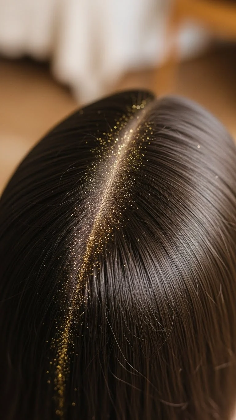 Apply a thin line of hair gel along the center part. Tap cosmetic glitter lightly on top. Works for straight or sleek hair. Minimal glitter keeps it wearable and comfortable. Wash out with shampoo afterward. Great for evening parties and photo-friendly looks.