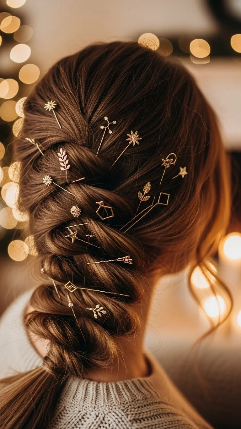 Braid hair loosely over one shoulder. Space gold pins evenly throughout for subtle shine. Works for long or layered hair. Adds a refined touch without heavy accessories. Comfortable and secure for all-day wear.