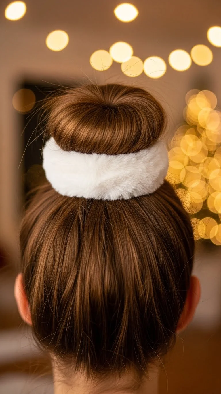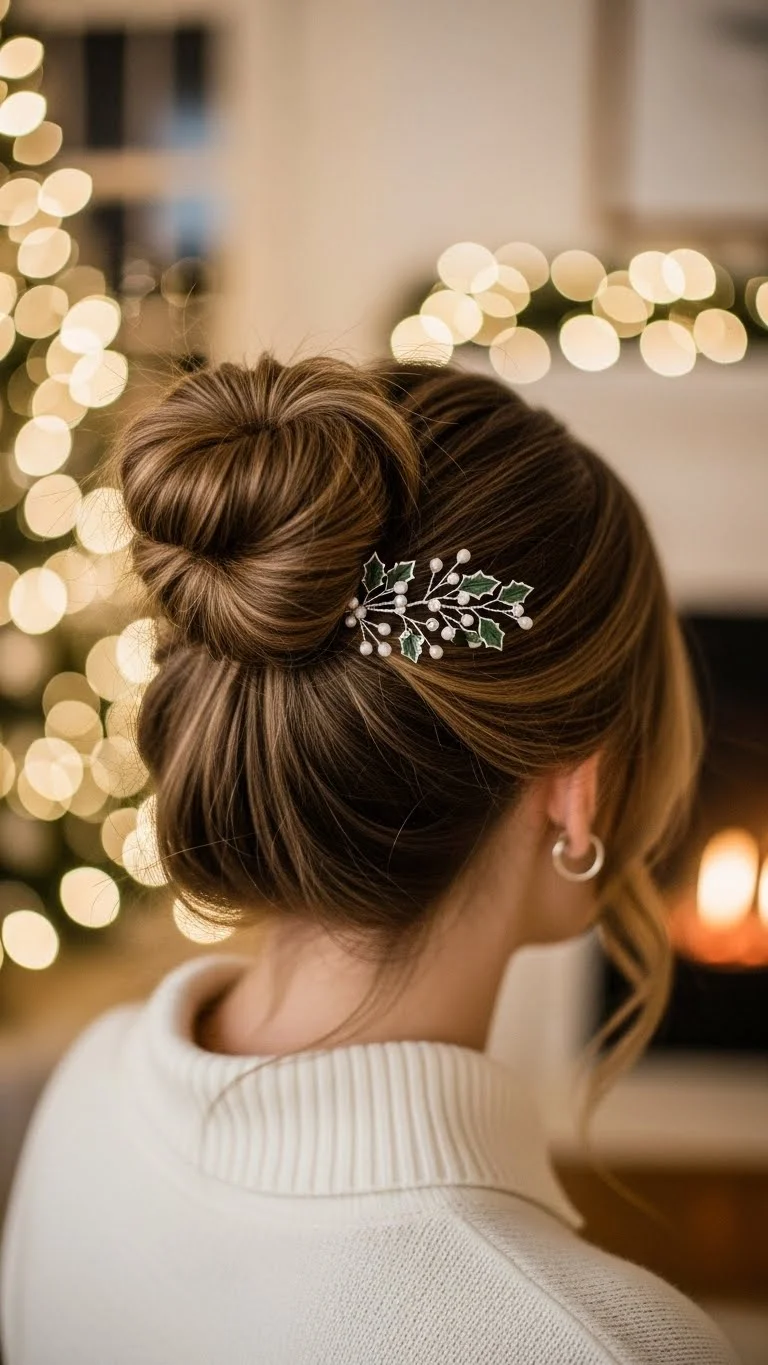 Pull hair into a messy top knot. Add a small holiday-themed clip at the base. Quick, effortless, and playful. Works for casual gatherings. Clips and accessories can be reused every year.