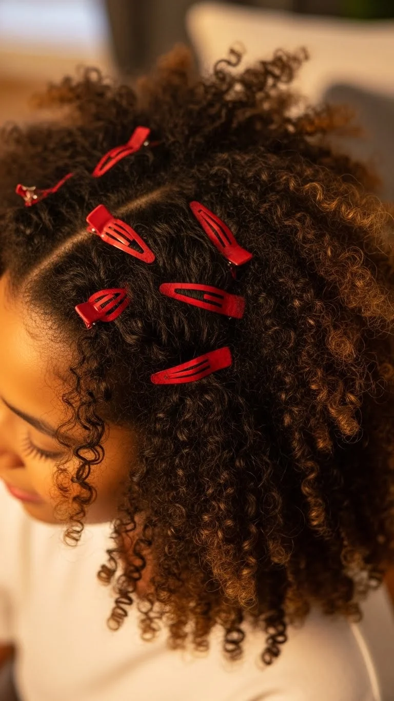 Define natural curls with cream. Place small red clips on one side. Avoid over-clipping to maintain balance. Works for short to medium-length curls. Quick, light, and festive. Clips are reusable and easy to store.
