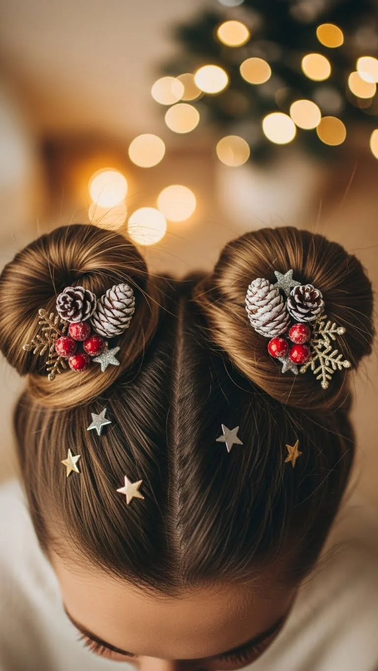 Create two small buns near the crown. Clip tiny ornaments around the base with bobby pins or small clips. Lightweight ornaments are best to prevent discomfort. Perfect for medium to long hair, and you can wear this style on second-day hair. Dry shampoo adds grip, and small clips or beads can replace ornaments if you want a subtler look. It’s fun, festive, and fully removable for everyday wear.