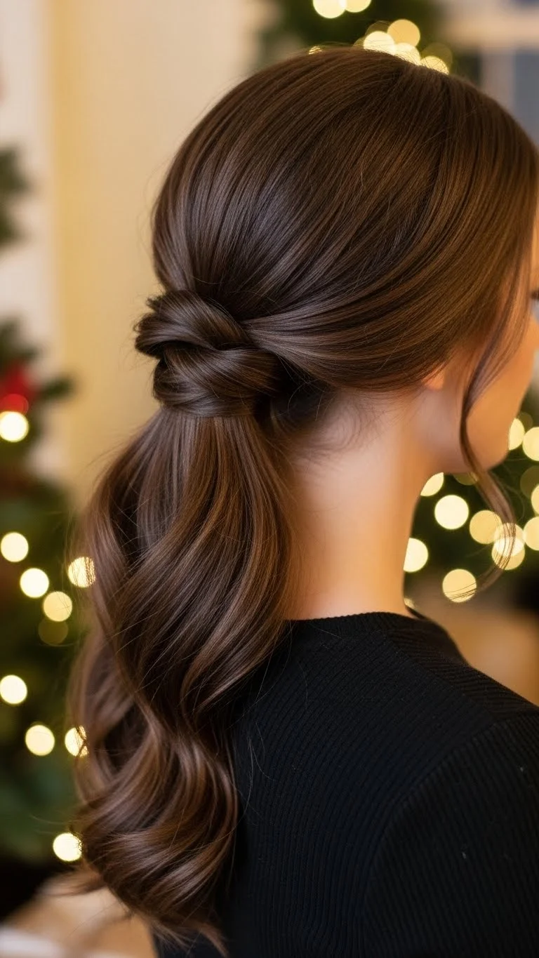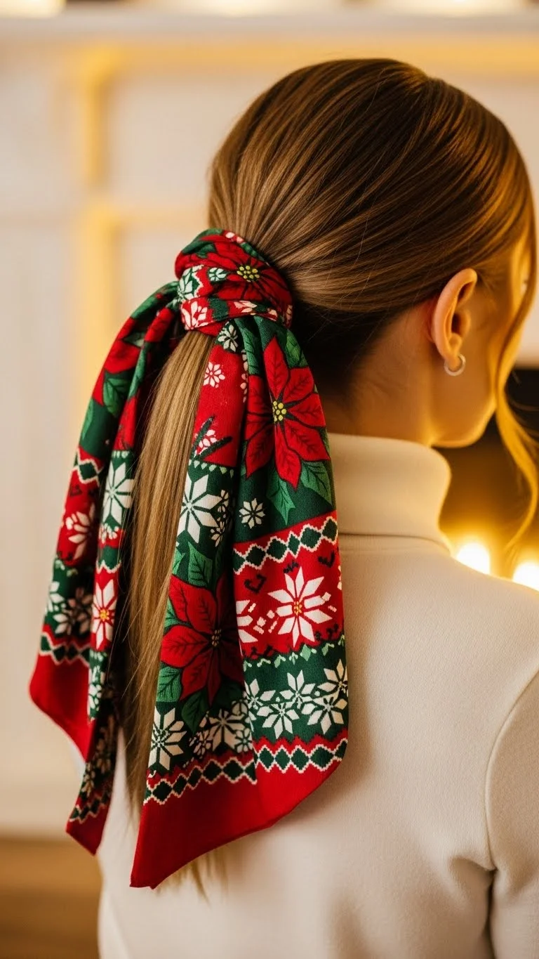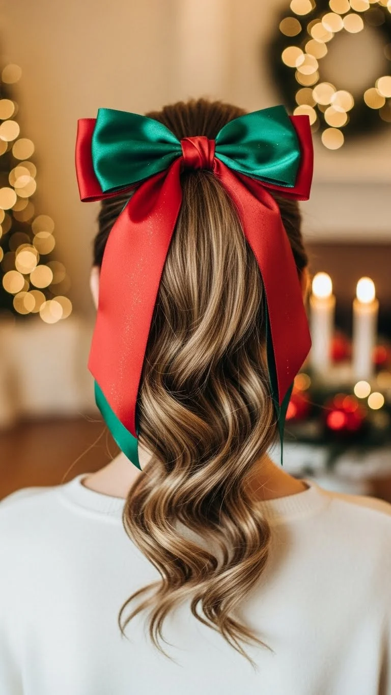 Brush hair straight into a high ponytail. Wrap a satin bow around the elastic. Medium-sized bows keep balance. Works for medium to long hair. Adds a polished festive touch with minimal effort.