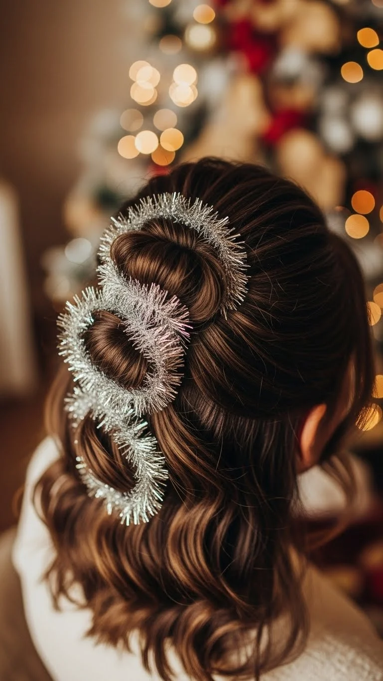 Take the top half of your hair and secure with an elastic. Add a few strands of silver or gold tinsel around the tied section. Keep it light to avoid tangles. Metallic thread can work as a substitute. Perfect for curly or straight hair, this style adds sparkle while staying comfortable. Remove the tinsel at night and store flat for reuse.