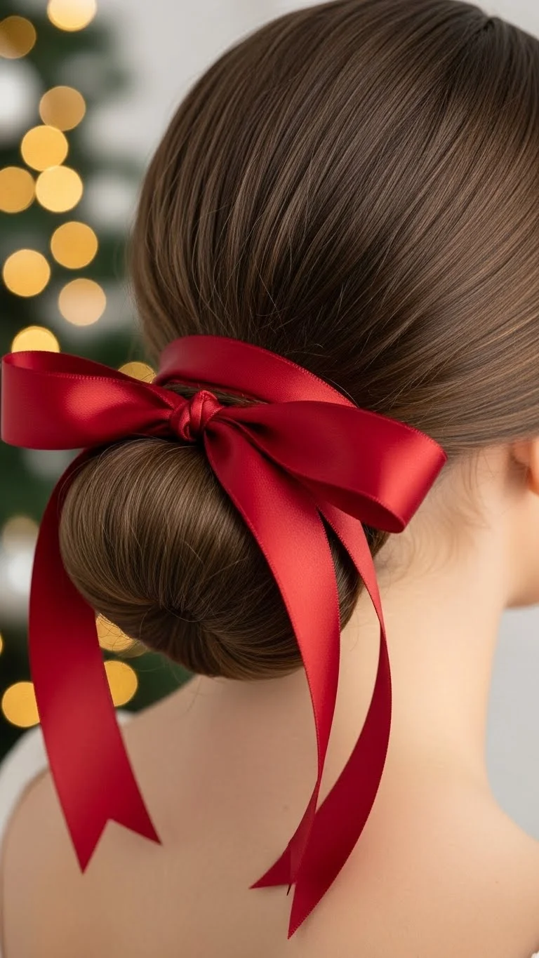 Brush hair into a low bun at the nape. Wrap a red ribbon around the base and tie a bow. Satin or craft ribbon works. Medium bows keep it balanced. This style is great for formal dinners or family portraits. Tease hair lightly for extra volume if needed. Reusing ribbon from gift wrapping is an affordable way to add festive flair.