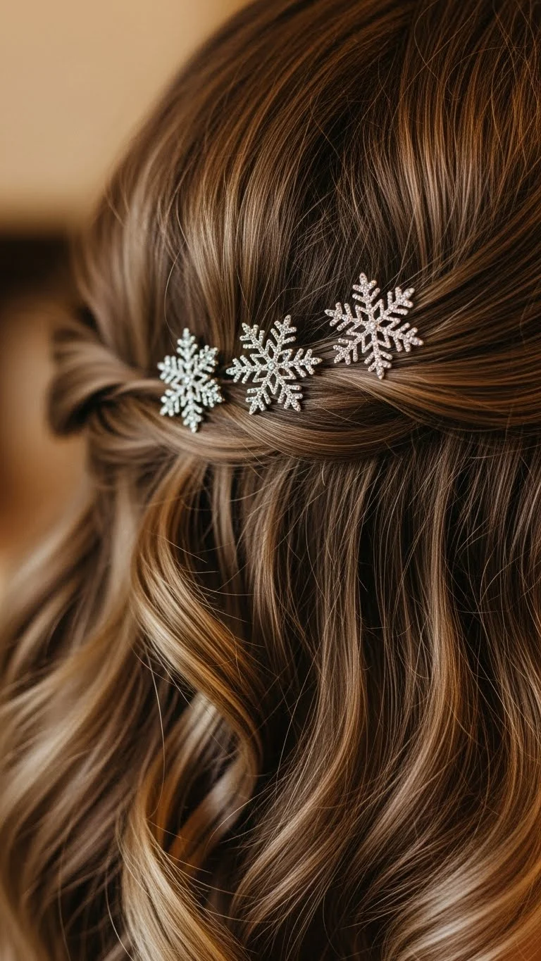 Create soft waves with a curling iron or heatless braids. Place small snowflake pins on one side for a winter touch. Space them out for balance. Pins are inexpensive and reusable. This style works on medium-length hair and is easy to maintain throughout the day. Remove pins afterward for an everyday wavy look.