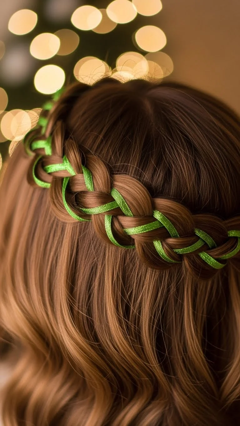 Braid hair around the head like a crown, weaving in a green ribbon for a festive hint. Thin embroidery thread can substitute for ribbon. Use bobby pins to secure ends and hide them under the braid. Perfect for long hair, this style stays secure and looks elegant for family events or photo sessions. Simple yet playful.