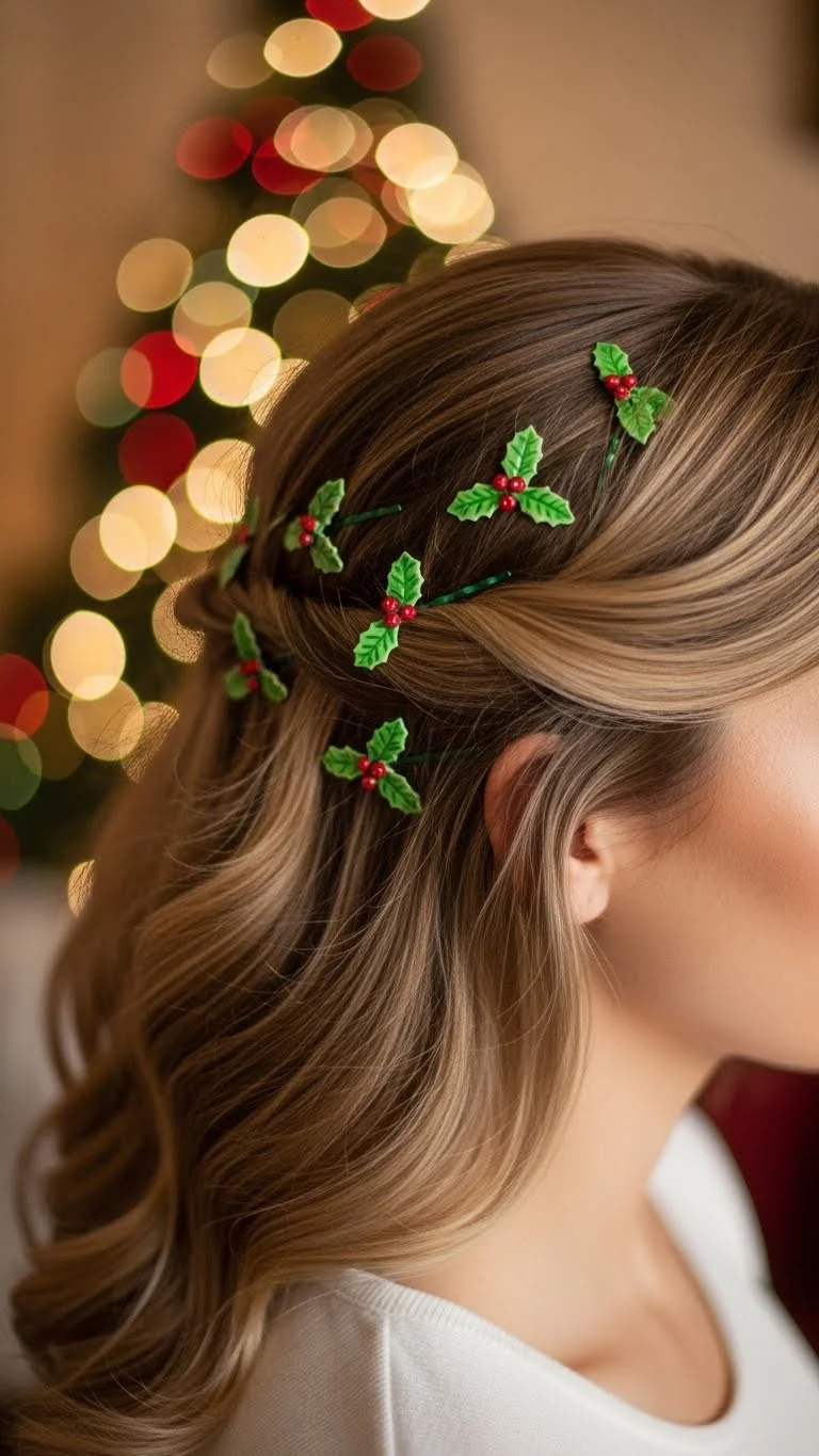 Sweep hair to one side and clip small holly-themed accessories near the temple. Use craft glue or beads if decorative clips aren’t available. Works for short and medium hair. No heat styling required. Clips are light and comfortable for all-day wear. Remove after the event and store for next year.