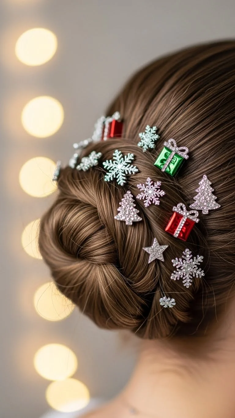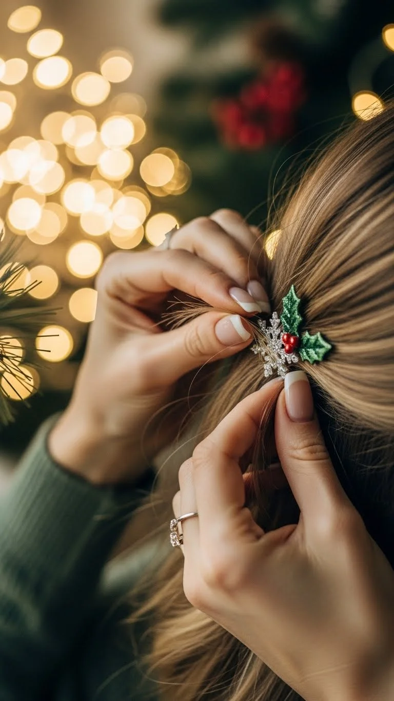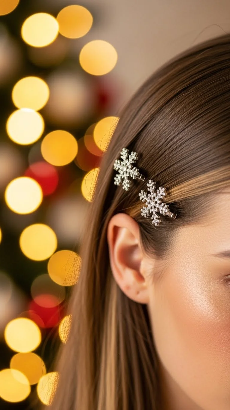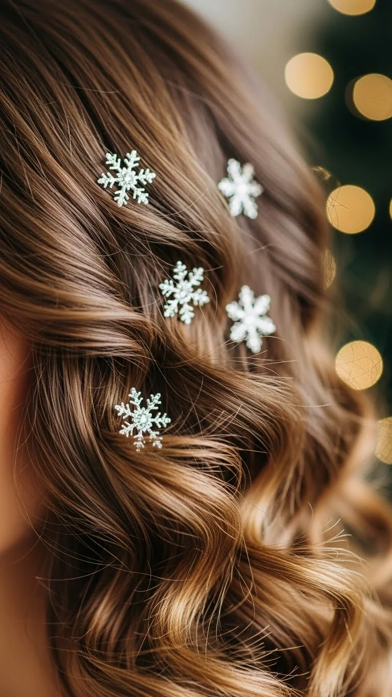 Side-swept curls create a cozy holiday mood. Curl the hair loosely and pin one side back. Add two or three snowflake pins for a winter touch. This style works for medium or long hair. Snowflake clips are easy to find at low cost, especially in seasonal craft aisles. Keep the curls soft so the pins shine. This look stays pretty through any celebration.
