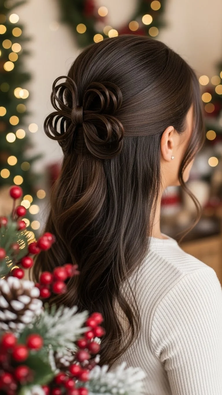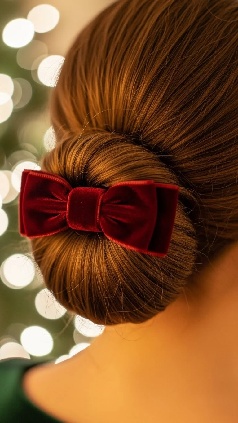A low chignon with a velvet bow adds charm without much effort. Twist the hair low and tuck the ends under to shape the chignon. Pin it carefully, then tie or clip on a velvet bow. It works beautifully for formal pictures or family dinners. Velvet bows are easy to reuse each year, making them a smart budget pick. Choose deep red, green, or neutral tones for a timeless look. This style stays neat for hours with minimal product.