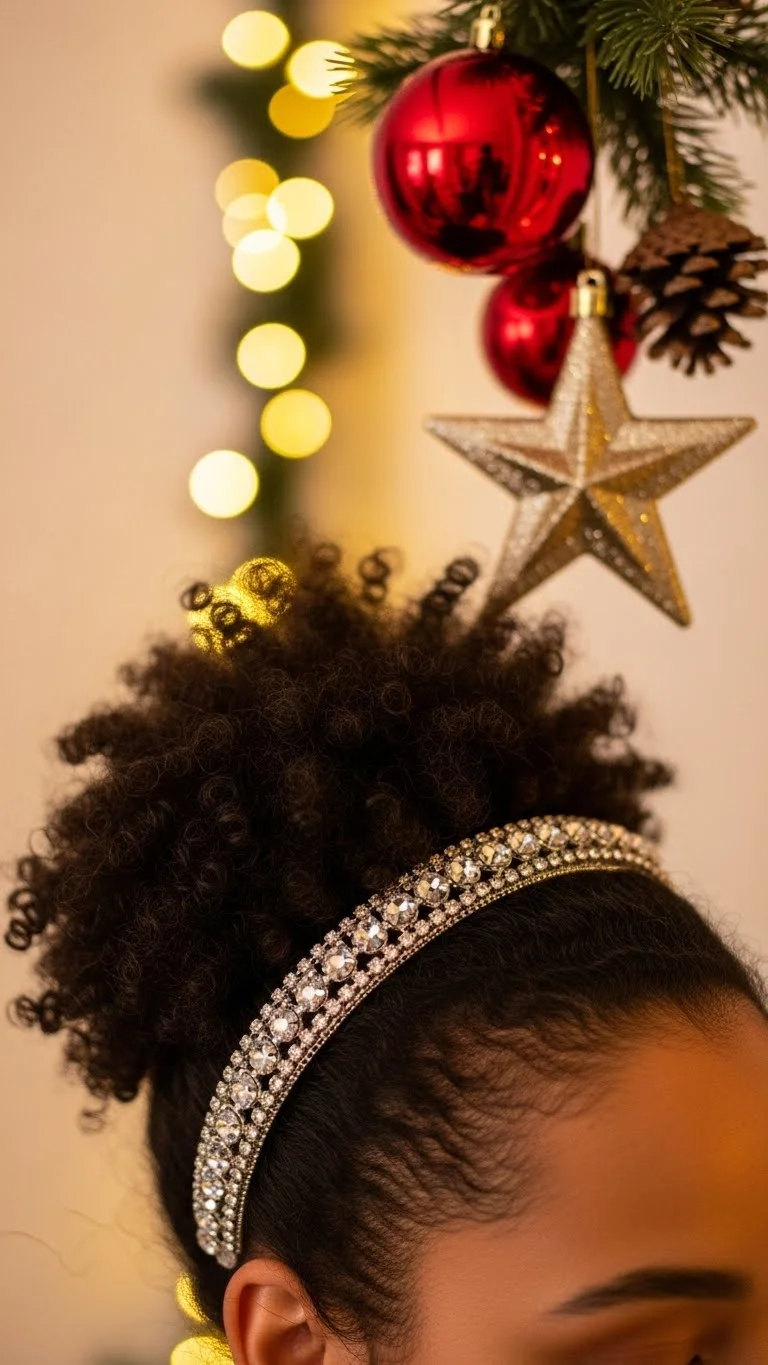 Curly hair shines with a simple headband. Gather the curls into a soft puff on top or at the back. Slide on a glittery headband for the holiday touch. Pick flexible bands so they stay comfortable. This works for all ages and takes seconds to finish. Headbands come in budget-friendly multipacks, so you can choose colors that match your outfit. This style keeps curls free and natural while adding a festive sparkle.