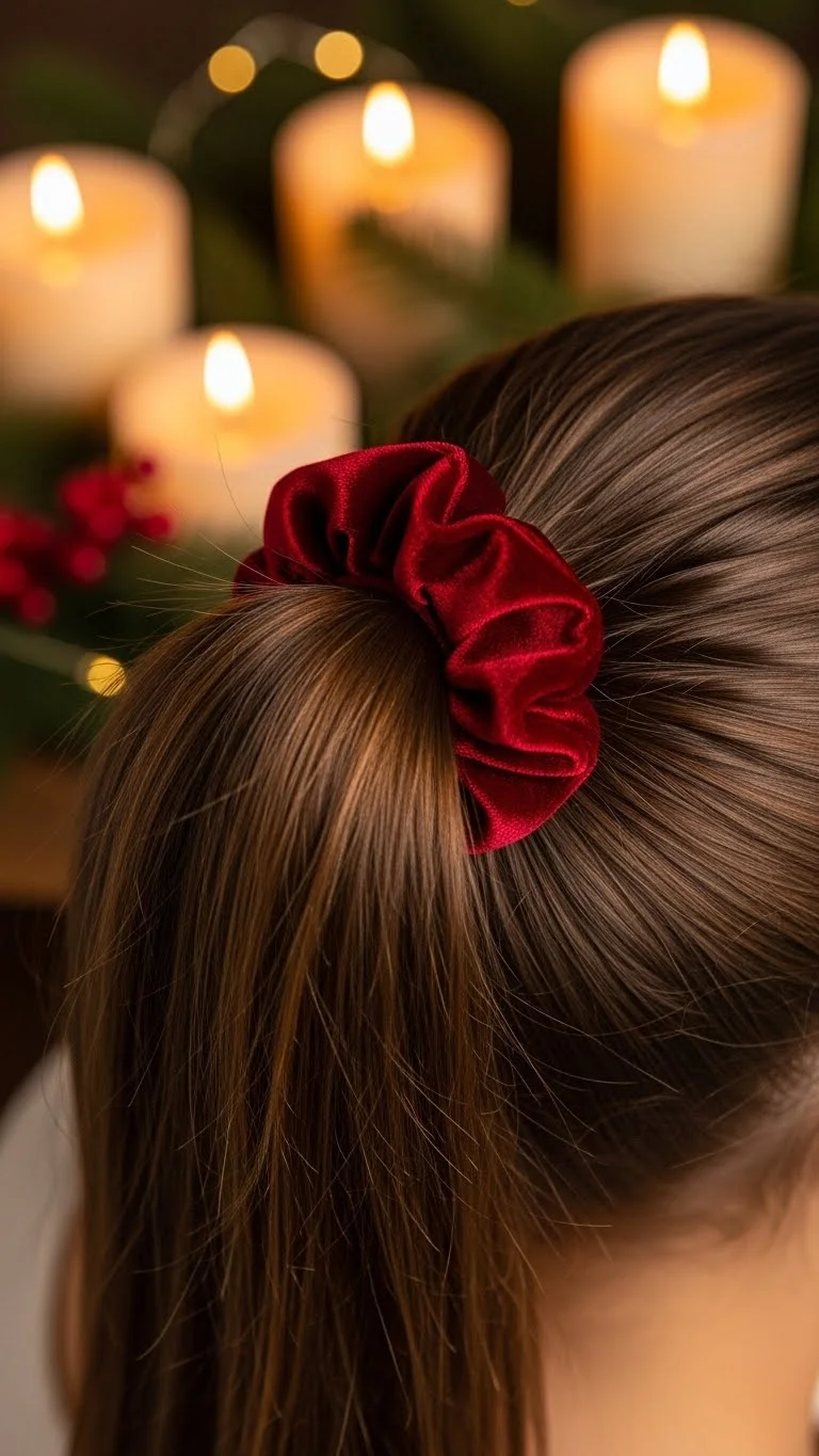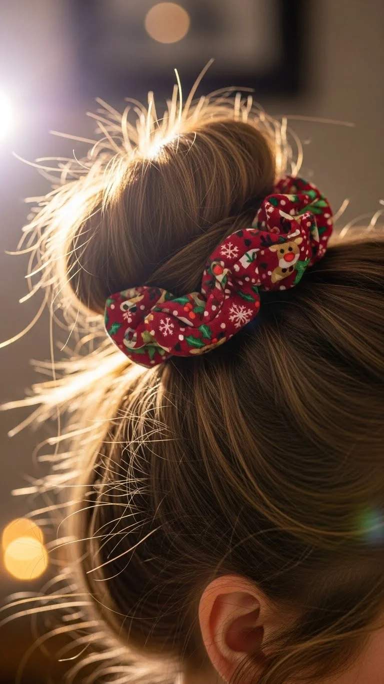 Turn a casual messy bun into a festive look with one holiday scrunchie. Pull the hair into a loose bun and wrap the scrunchie around it. Let some strands fall naturally. This works for quick holiday errands, family events, and cozy nights inside. Scrunchies with plaid or soft sparkle add character without any extra work. They’re also budget-friendly, especially in multipacks. This style is flexible and comfortable for long wear.