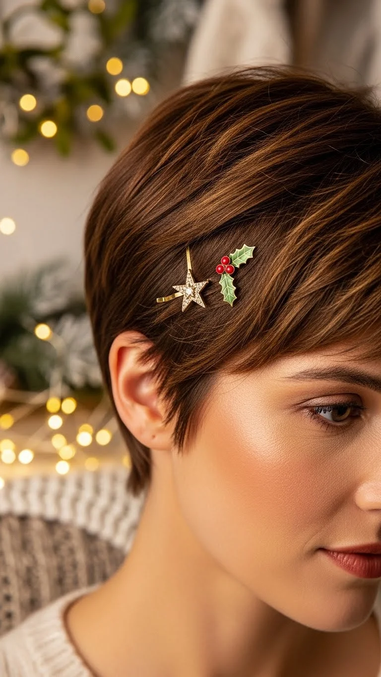 Pixie cuts can look cheerful with a pair of small holiday clips. Add a slight wave with a mini iron or keep it natural. Slide the clips on one side to brighten the look. Choose lightweight clips so they sit well on short hair. If you want a cost-saving trick, use simple metallic clips and glue small seasonal charms on top. This style takes under a minute, making it great for busy mornings.