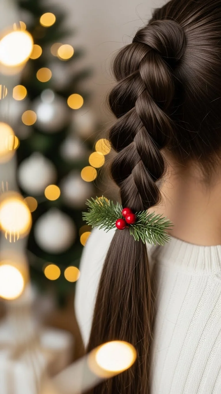 A braided ponytail looks sweet with a small evergreen tie. Pull the hair into a mid-height ponytail, then braid the length. Add a faux evergreen sprig or clip around the base. Choose lightweight pieces so the ponytail doesn’t pull. You can make your own evergreen tie from leftover décor, keeping the project budget-friendly. This style works well for outdoor events and keeps hair neat.