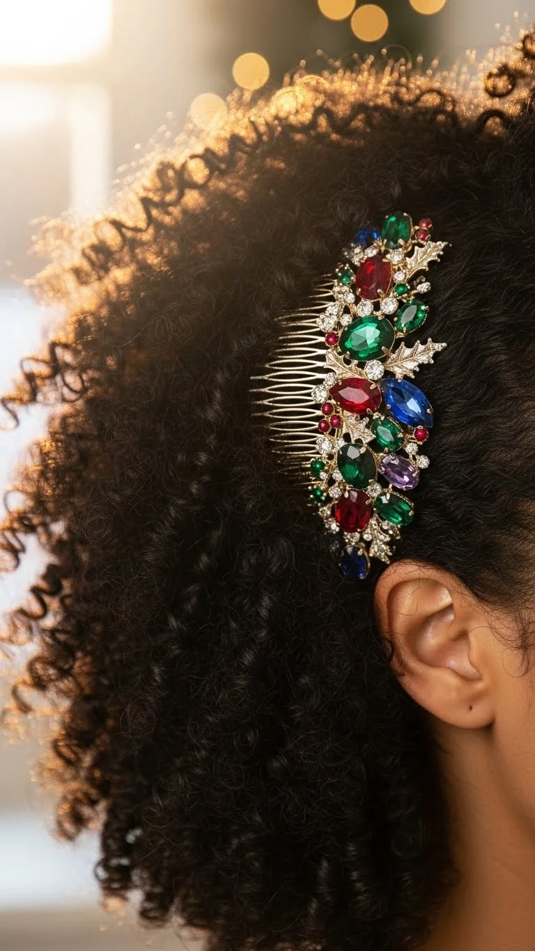 A festive comb can brighten any curly style. Add volume by fluffing the curls gently. Slide a decorative comb on one side to add color or sparkle. Comb accessories can be found in holiday sections for a small price. Pick a shape that feels comfortable. This style takes very little effort but looks ready for seasonal gatherings.