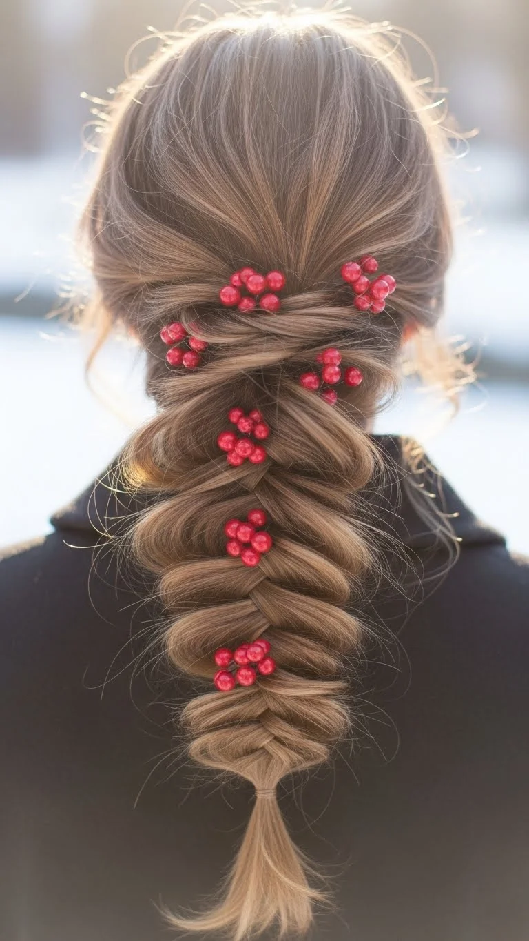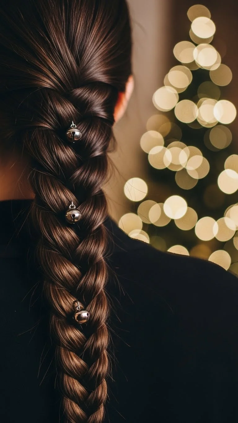 A low braid with tiny holiday bells adds gentle movement. Brush the hair smooth, then tie it low at the nape. Braid loosely or tightly, depending on comfort. Attach two or three tiny bells on bobby pins and slide them near the base. Pick lightweight bells so the braid stays comfortable. This works for kids going to school events and adults heading to a cozy dinner. If you don’t want to buy special accessories, repurpose old ornament hooks and secure small bells from craft supplies. They usually cost very little and last through several uses. Keep the braid simple so the bells stand out. This is a quick way to bring a cheerful touch without using lots of products.