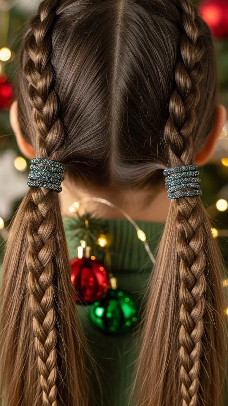 Pigtail braids bring charm for all ages. Part the hair down the middle and braid each side. Use elastics with a soft sparkle to add a festive touch without making the style heavy. For kids, this keeps hair tidy during busy parties. Adults can widen the braids for a more relaxed shape. Elastic multi-packs are inexpensive and easy to store for future wear.