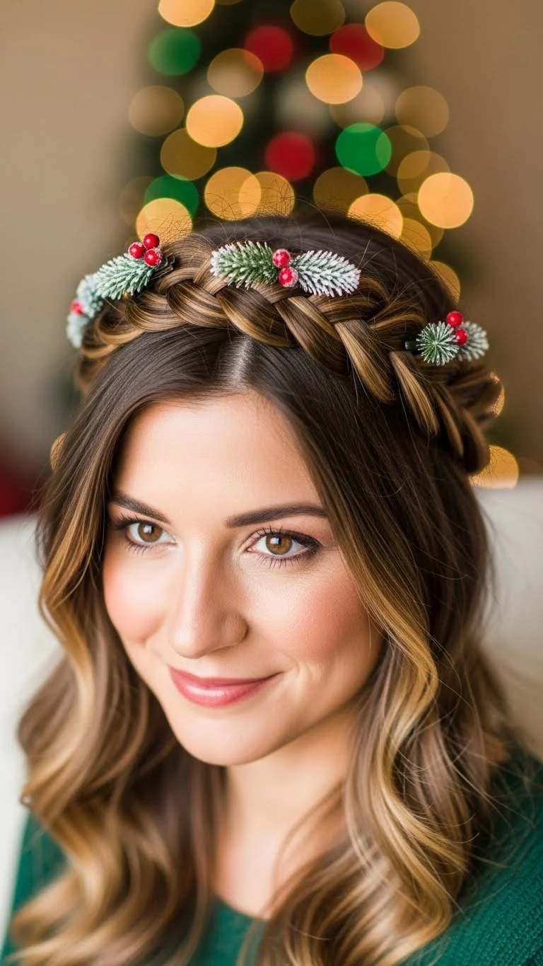 A braided crown brings a warm storybook vibe. Split the hair in half, braid both sides, and wrap each braid across the top of the head. Pin them gently. Add small pine-inspired clips or faux greenery for a seasonal touch. Keep the pieces small so the look stays balanced. This works great for adults who want something special without going overboard. Kids may prefer lighter clips so the style feels comfy. If you like a handmade approach, craft mini greenery clips using leftover décor. They attach easily and keep costs low. This style stays secure for hours with a few sturdy pins.