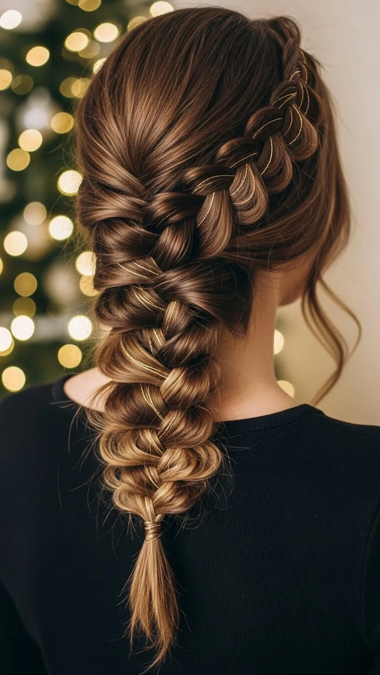 A French braid with gold thread adds shine without going overboard. Start braiding from the crown and weave in a thin metallic thread. Keep the braid loose for a relaxed effect. This works for teens and adults wanting a simple festive style. Gold thread is inexpensive and can be reused. If the thread slips, tie small knots at sections to keep it stable. This style looks great in photos and holds well for busy gatherings.