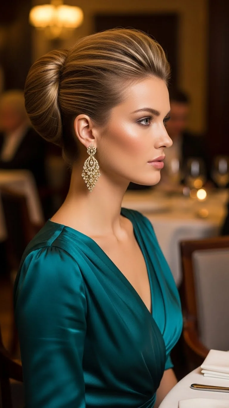 A French twist is the ultimate partner for a backless dress. It shows off your shoulders and the detail of the gown. Don’t worry about making it perfect. A slightly messy version looks more modern. Gather your hair like a low ponytail, then twist it upward against the back of your head. Tuck the ends into the “tunnel” created by the twist. Secure the entire length with a large claw clip for a casual date, or several pins for a formal one. If pieces fall out, let them. Framed faces look softer and more romantic in dim light.