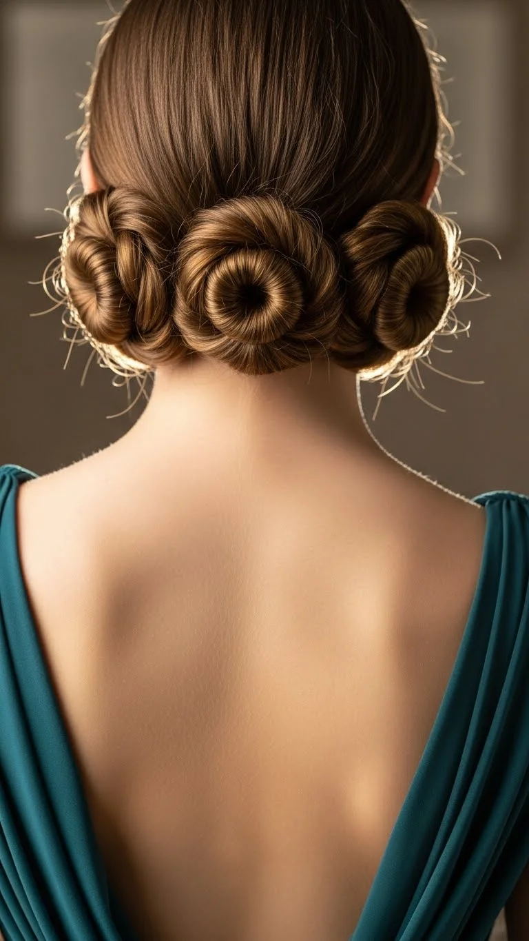 This looks much more complicated than it is. Divide your hair into three equal sections at the back. Twist each section into a small bun and pin them side-by-side. The result is a wide, textured updo that looks like it took hours. It is very stable because the weight is distributed. This style is perfect for showing off a backless dress or a delicate necklace. It works even if your hair isn’t very long.