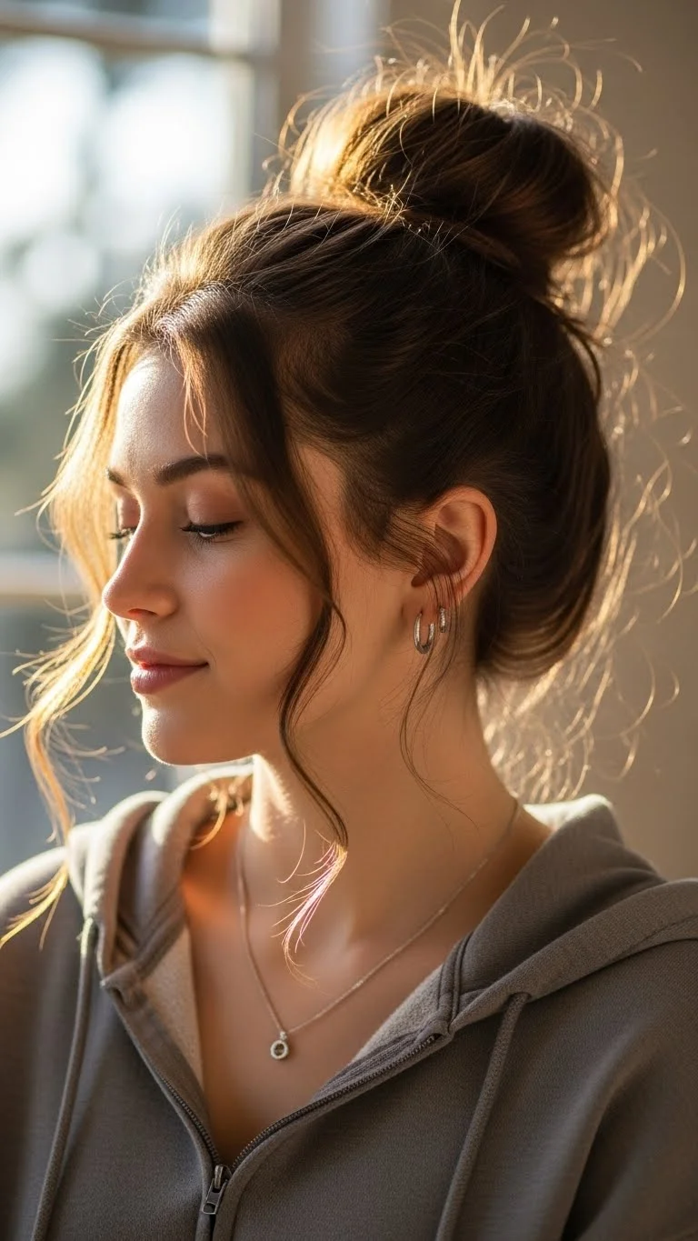 A top knot can be elegant if you leave a few “tendrils” out. Pull your hair into a bun at the very top of your head. Pull out two thin strands near your temples. Use a flat iron to give those strands a slight “S” wave. This softens the look and prevents it from looking like a “gym bun.” It is a great choice for a movie night or a low-key dinner. It pairs well with oversized sweaters or casual hoodies while still looking like you tried.